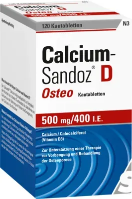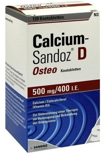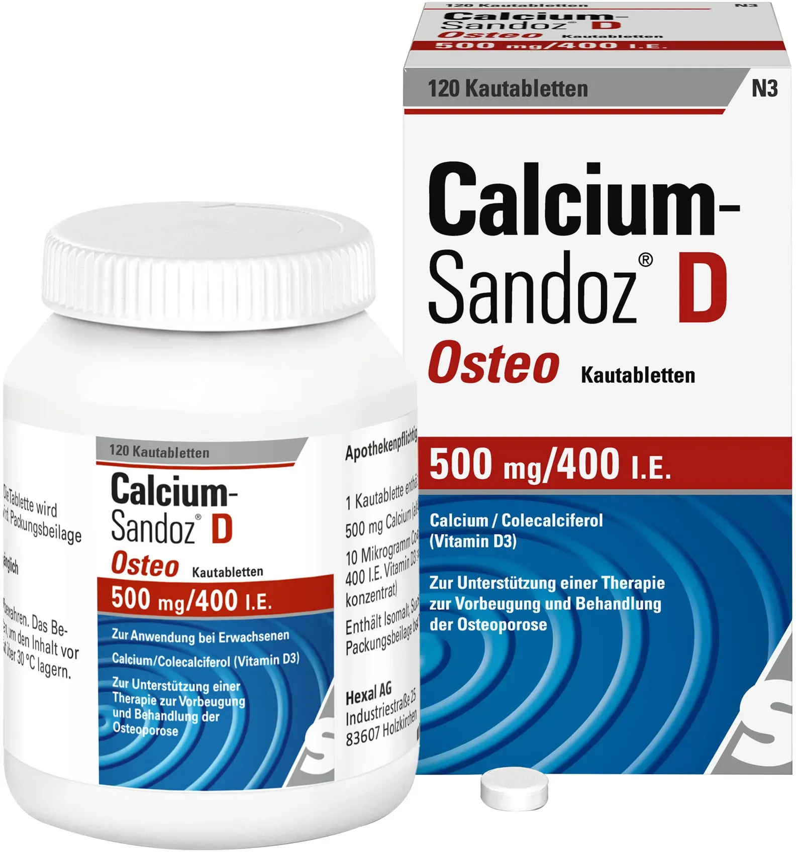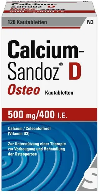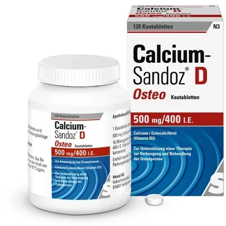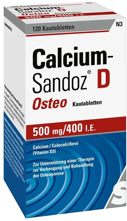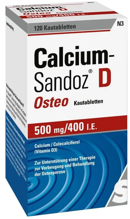 Kategorie: Arzneimittel - Hexal - GTIN:4150004904296 - PZN:00490429 - Wichtige Hinweise (Pflichtangaben): Calcium-Sandoz D Osteo Kautabletten 500 mg/400 I.E. . Anwendungsgebiete: Zur Vorbeugung und Behandlung von Vitamin-D- und Calcium-Mangelzuständen bei älteren ... - 22,99 Euro bei Mycare - gefunden von billiger.de ![]() ![]() Hexal Calcium-Sandoz D Osteo 500mg/400 I.E. 120 St Kautabletten