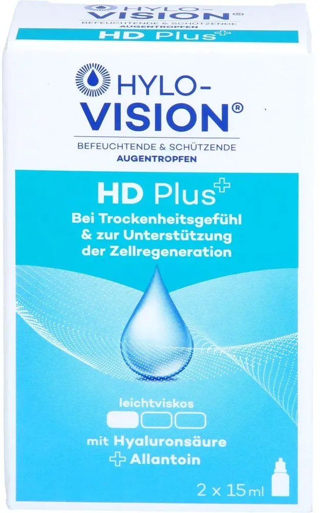 Befeuchtende & schützende Augentropfen. Bei Trockenheitsgefühl & zur Unterstützung der Zellregeneration. Zur Linderung bei Trockenheitsgefühl, Reizung und leichten Irritationen. Unterstützt aufgrund seiner Zusammensetzung die Zellregeneration. 15 ml oder 2 x 15 ml Benetzungslösung, enthält 0,2 % Hyaluronsäure und Allantoin (leichtviskos). Nach Anbruch 90 Tage verwendbar. Für harte und weiche Kontaktlinsen geeignet. - bei ipill.de - aus Yadore Produktdaten ![]() ![]() OmniVision HYLO-VISION HD Plus Augentropfen 30 ml