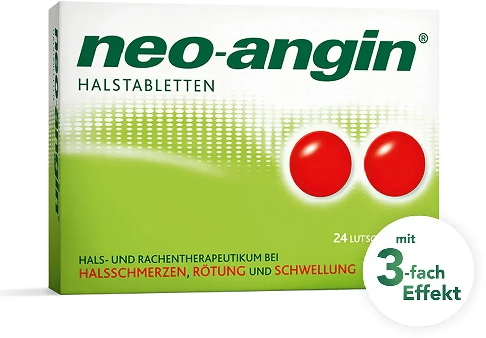 25 Händlerangebote bei billiger.de - Kategorie: Arzneimittel - Klosterfrau - Anwendungsgebiet von Neo-Angin HalstablettenNeo-Angin Halstabletten werden vorbeugend und zur Behandlung von entzündlichen und infektiösen Erkrankungen des Mund, Hals- und Rachenraumes verwendet (z.B. bei Halsschmerzen, Erkältung, Heiserkeit, Schluckbeschwerden, Mandelentzündung, Entzündung der Mundschleimhaut, des Zahnfleisches, Rachenkatarrh, Kehlkopfkatarrh, zur Vorbeugung bei Gefahr grippaler Infekte).Wirkungsweise von Neo-Angin HalstablettenNeo-Angin Halstabletten wirken aktiv gegen Krankheitserreger und lindern sehr schnell Halsschmerzen. Dadurch wird die Schleimhautflora im Rachen, die eine wichtige Schutzfunktion vor dem Eindringen von Erregern ausübt, stabilisiert. So wird es weiteren Erregern erschwert Infektionen wie z.B. eine Angina oder Mandelentzündung auszulösen.Wirkstoffe / Inhaltsstoffe / ZutatenInhaltsstoffe von Neo-Angin Halstabletten: 1.2 mg 2,4-Dichlorphenylmethanol, 0.6 mg Amylmetacresol, 5.9 mg Levomenthol Hilfsstoffe von Neo-Angin Halstabletten: Cochenillerot A, Glucosesirup Trockensubstanz, 1.14 g Glucose, Pfefferminzöl,1.42 g Saccharose, Sternanisöl, Weinsäure, 0.22 BE Gesamt Kohlenhydrate GegenanzeigenBei überempfindlichkeit gegenüber einen der oben genannten Inhaltsstoffe insbesondere bei Benzylalkohol, ätherische öle und Terpentinöl sollte das Produkt nicht angewendet werden. Kinder unter dürfen das Medikament nicht anwenden. Während Schwangerschaft und Stillzeit ... ![]() ![]()