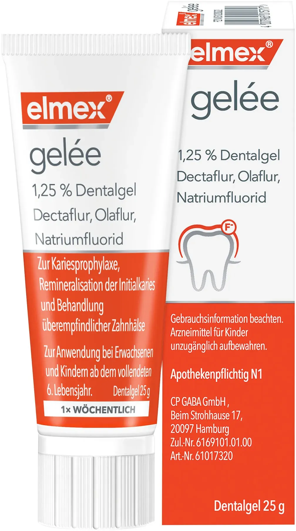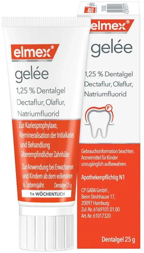 452,80 /kg - Kategorie: Zahnpflegeartikel - Elmex - GTIN:4007965015717 - PZN:03120822 - Elmex Gelee Zur Kariesprophylaxe, Remineralisation der Initialkaries und Behandlung überempfindlicher Zahnhälse. 1x wöchentlich Elmex Gelee, für gesunde, starke Zähne. Zu Risiken und Nebenwirkungen lesen Sie die Packungsbeilage und fragen Sie Ihren Arzt oder Apotheker. - 11,32 Euro bei medikamente-per-klick.de - gefunden von billiger.de ![]() ![]() ELMEX GELEE 25 g