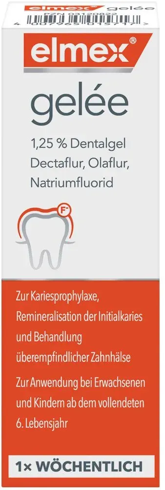 519,60 /kg - Kategorie: Zahnpflegeartikel - Elmex - GTIN:4007965015717 - PZN:03120822 - Anwendungsgebiet von Elmex Geleeelmex gel e Zahnpasta zum Schutz vor Karies und Zahnschmerz. Mit Elmex Gelee machen Sie Ihren Kariesschutz noch effektiver. Nur 1 x wöchentlich Elmex Gelee anwenden und Sie leisten schon einen aktiven Beitrag zum Schutz und der Remineralisierung des Zahnschmelzes. Wenden Sie Elmex Gelee an zur: Kariesprophylaxe Remineralisierung der Initialkaries Behandlung überempfindlicher Zahnhälse Beginnende Karies ist umkehrbar - mit elmex gel e. Die wöchentliche Intensivkur mit hochkonzentriertem Aminfluorid. Gesunde, starke Zähne für die ganze Familie Macht beginnende Karies durch Remineralisierung rückgängig Stärkt den Zahnschmelz und reduziert das Kariesrisiko Behandelt überempfindliche Zahnhälse Bereits ab dem vollendeten 6. Lebensjahr anwendbar Eignet sich als wöchentliche Intensivkur für die ganze Familie Was ist Initialkaries? Verliert der Zahn Mineralien, entsteht unter der Oberfläche eine sogenannte Initialkaries. Dies ist eine frühe Form der Karies, bei der die Mineralienverluste auf den Zahnschmelz begrenzt sind und die Oberfläche noch intakt ist. Initialkaries tritt bei Kindern und Jugendlichen üblicherweise am Zahnfleischrand und an den Kauflächen sowie im Erwachsenenalter in den Zahnzwischenräumen auf. An den Glattflächen der Zähne zeigt sich eine Initialkaries meist als ein kreidig weißer Fleck. Beginnende Karies ist umkehrbar mit elmex gel e elmex ... ![]() ![]() ELMEX GELEE 25 g