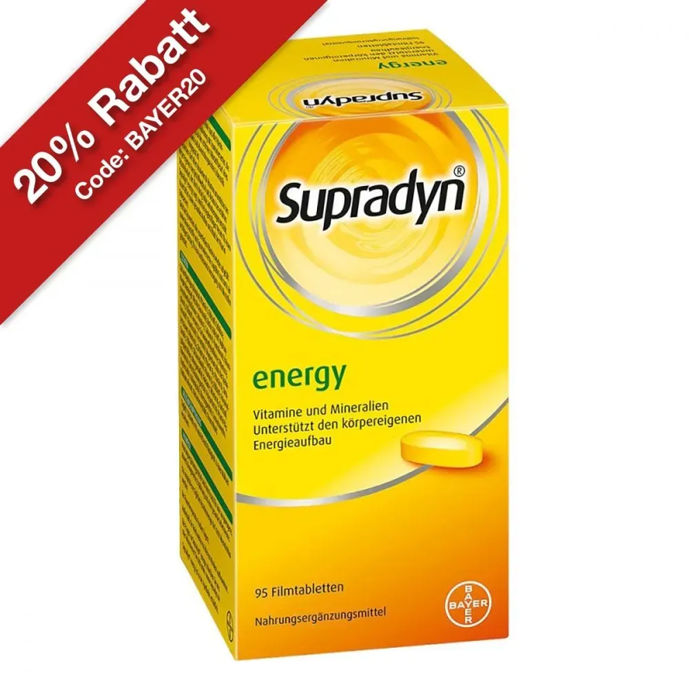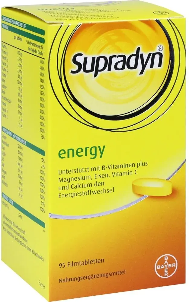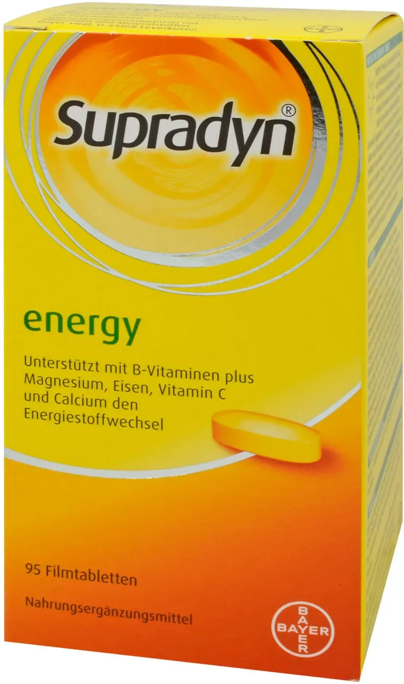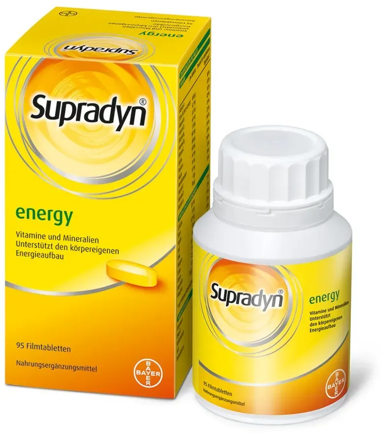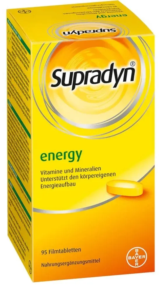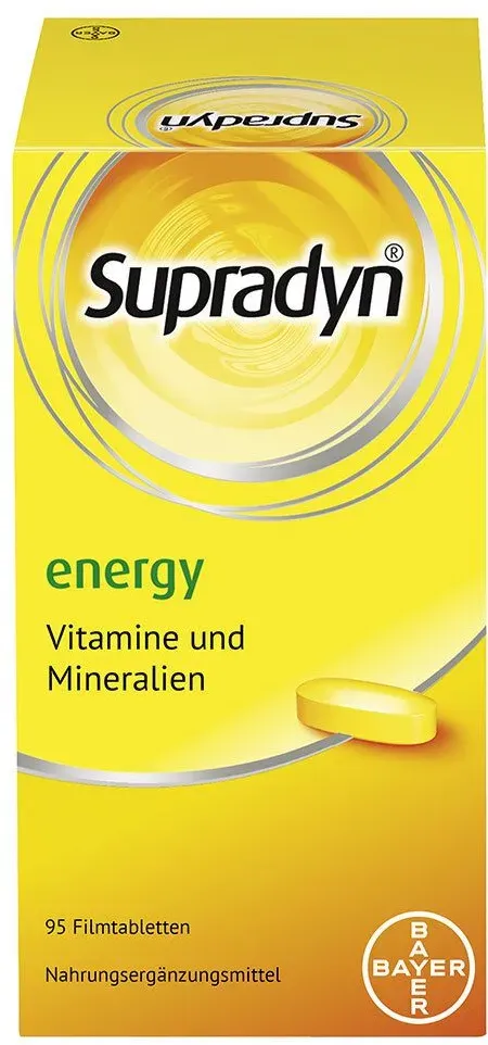 0,36 /Stück - Kategorie: Nahrungsergänzungsmittel - Bayer - GTIN:4057599005707 - PZN:09389695 - Supradyn energy Filmtabletten 95 Stück - von Bayer Vital GmbH Geschäftsbereich Selbstmedikation - Kategorie: Leistungssteigerung - versandkostenfrei - 33,90 Euro bei healthii - gefunden von billiger.de ![]() ![]() Bayer SUPRADYN Filmtabletten 95 St