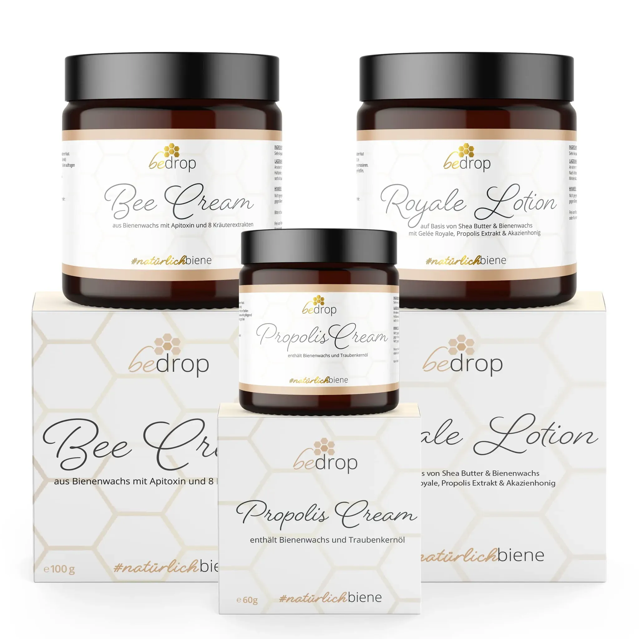 Zustand: Neu - 259,00 € / kg - Cremes - bedrop bedrop.de von FLBE Health UG (haftungsbeschränkt) - Bienengiftsalbe von bedrop abk-1703 - EAN: 0098931289601 - ðŸ Echte Bienengiftsalbe / Bienengift Salbe: Bienengift aus 100% Imkerqualität & natürlichem Ursprung. Die Bienengiftcreme wurde verfeinert mit Bienenwachs & 8 Kräuterextrakten wie zB. Aloe Vera, Ringelblume, Eukalyptus und Rosskastanie. 💛 SICHERE PRODUKTION: Unter strengen Voraussetzungen und genausten Hygiene-Standards werden unsere Produkte mit Liebe in Deutschland hergestellt. 🔬 KONTROLLE: Unsere Produkte werden in regelmäßigen Abständen von zertifizierten Laboren geprüft. Reich an einem 20 Aminosäuren & Natur-Kräutern. Frei von Silikonen, Parabenen und chemischen Zusätzen. 🌱 NACHHALTIGKEIT: Inkl. stilvolle, praktische Umverpackung für einen sicheren Transport. Generell verwenden wir bei unserer Bienengiftcreme nur nachhaltige Materialien zB. Glas & Recycling-Etiketten. 🙠Pflegende & schützende Eigenschaften: Kann unterstützend für Rücken, Gelenke & Muskeln eingesetzt werden. Es wirkt kühlend und ist angenehm aufzutragen. - Verkäufer: bedrop #natürlichbiene im amazon.de Marketplace Dieses Sparset von bedrop bietet eine umfassende Hautpflege mit Bienengiftsalbe, Propolis Cream und Gelee Royale Körperlotion. ![]() ![]() bedrop Hautpflege-Set | Bee Cream (Bienengiftsalbe) 100g + Propolis Cream (Propolis Salbe) 60g + Gelee Royale Körperlotion (Royale Lotion) 100g im Sparset