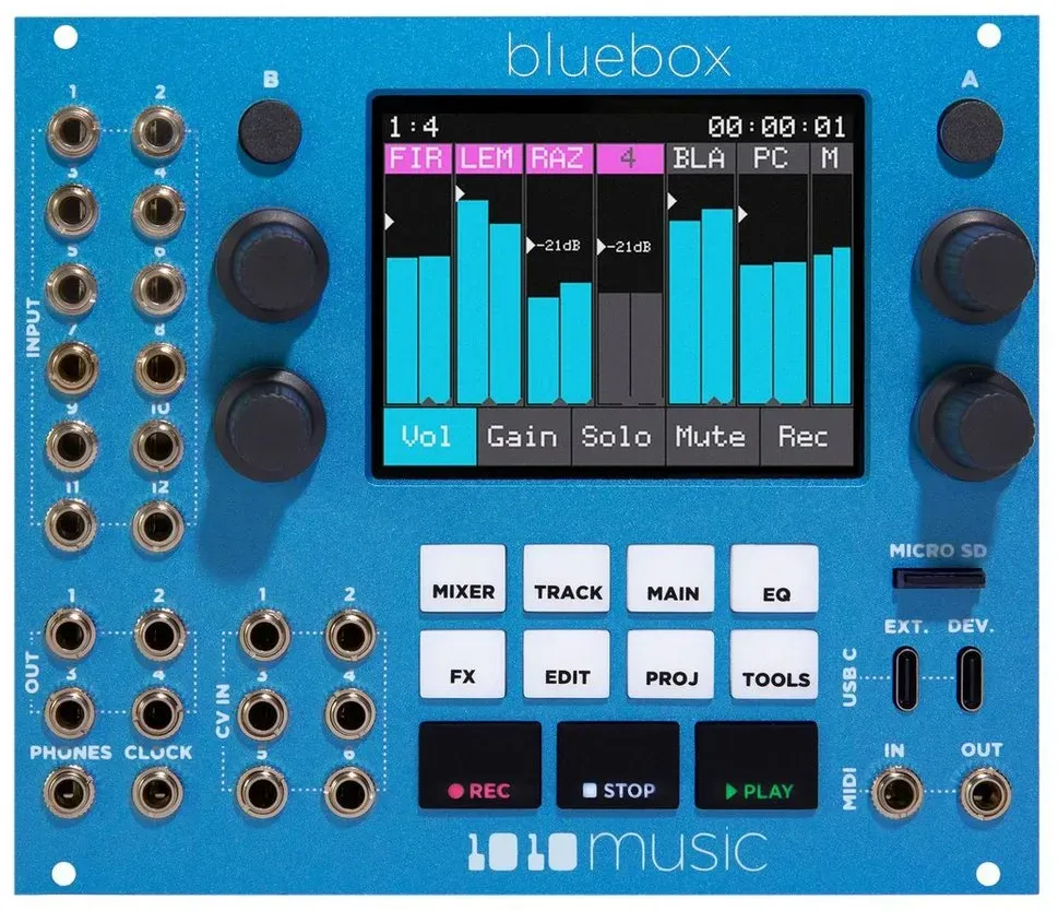 Musik Instrumente Lifestyle - - 3,5 Touchscreen. Mehrspur-Audiorecorder mit 24 Bit / 48 kHz. Einstellmöglichkeiten je Kanal: Lautstärke, Gain, parametrischer 4-Band-EQ, Panorama, Mute, Solo. Effekte: Reverb, Delay, Master-Kompressor. Ein- und Ausgänge frei konfigurierbar. MIDI-Sync für Metronom, Effekte und externes Equipment. Aufzeichnung erfolgt auf MicroSD-Karte. viel Headroom für hohe Eurorack-Pegel. 12 Audioeingänge. 4 Audioausgänge. Kopfhörerausgang. Clock-Ausgang. 6 CV-Eingänge. MIDI In Out. USB-C für externe MIDI-Controller und Sync/Clock. USB-C für 2-Kanal-Audio. inkl. 2 MIDI-TRS Adapter MicroSD Card . Eurorack-fähiger Digital Mixer mit Touchscreen - Die BlueBox von 1010 Music. Die BlueBox Eurorack Edition von 1010 Music ist ein Digital Mixer mit zwölf Audioeingängen, Effekten, MIDI-Steuerung und Audiorecorder. Das erweiterte und leicht abgewandelte Modul entspricht in sämtlichen Spezifikationen der. Die zwölf Audioeingänge lassen sich nach belieben zu Stereopaaren konfigurieren, bei z. B. zwei Stereospuren bleiben noch acht Monospuren übrig. Die vier Audioausgänge sind ebenso frei zuweisbar; in den meisten Setups werden sich wohl zwei Stereo-Ausgänge bewähren. Ein Kopfhörerausgang rundet die Audioanschlüsse sinnvoll ab, so kann man direkt am Modul in die Tiefe hören. Sechs CV-Eingänge erweitern die kreativen Möglichkeiten der BlueBox ungemein, auf Panning oder FX-Send geroutet hat man mit entsprechenden CV-Quellen direkt wieder die Hände für die Performance frei. ... ![]() ![]()