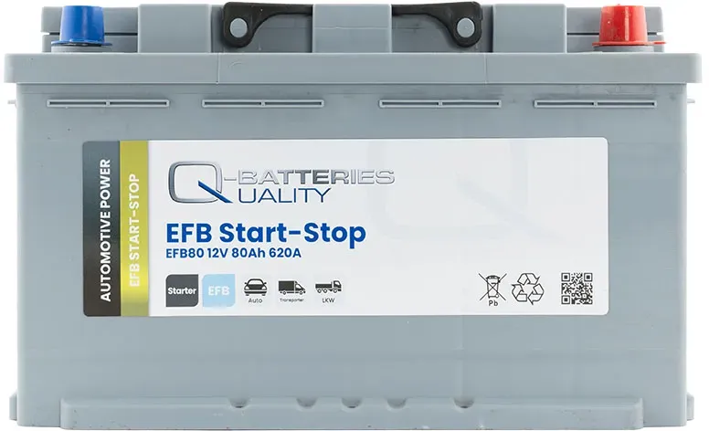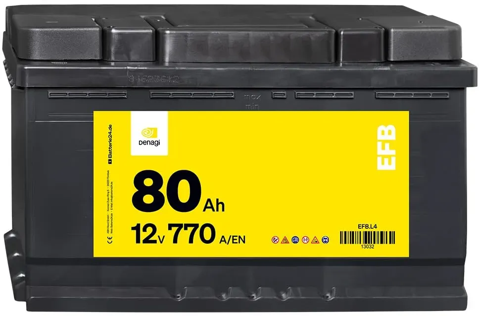 Kategorie: Autobatterien - Quality Batteries - GTIN:4250889666354 - Q-Batteries Start-Stop EFB Autobatterie EFB80 12V 80Ah 620A - 97,73 Euro bei online-batterien.de - gefunden von billiger.de Die Denagi EFB ist eine gute Option für Start-Stopp-Fahrzeuge mit 12V 80Ah und 770A, die zudem wartungsfrei ist. ![]() ![]() Denagi EFB 12V 80Ah Autobatterie 770A/EN Starterbatterie, Start-Stopp & Standheizung geeignet, absolut wartungsfrei