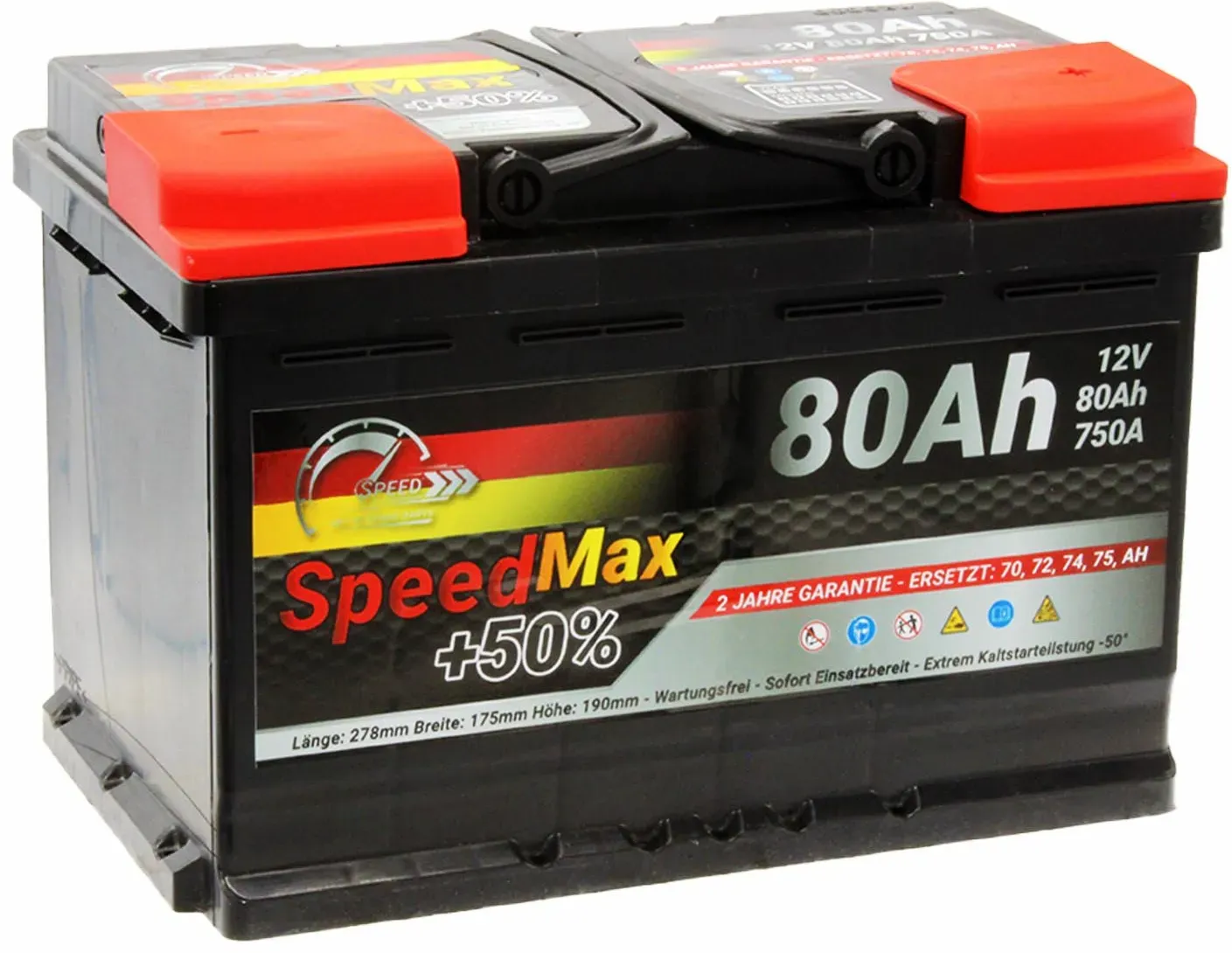 Kategorie: Autobatterien - Speed - GTIN:8000000008725 - Autobatterie SMC Marke SPEED Original Batterie 80 Ah 12 V 680 A mit Pluspol rechts Maße: 278 mm, Länge: 190 mm, Höhe: 175 mm Code 7903639 L380 mit n SMC- Um die Kompatibilität der Batterie zu überprüfen, müssen Sie einfach die Maße und die Stromstärke der angegebenen Batterie mit denen Ihrer Autobatterie vergleichen - 68,50 Euro bei Amazon Marketplace Automotive - gefunden von billiger.de Die SMC Autobatterie Speed Max ist eine weitere kostengünstige Option mit 12V 80Ah und 750A, die für hohe Energiebedarfe geeignet ist. ![]() ![]() SMC Autobatterie Speed Max 80Ah 12V 750A L3 Starterbatterie für Autos mit hohem Energiebedarf ersetzt 70 71 72 75 77 80 ah überlegene Leistung Pluspole Recht Wartunsfrei