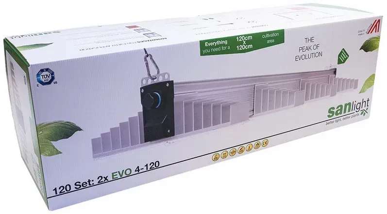 Brands SANlight Innenbeleuchtung - EAN:9120069232462 - Innovative LED-Pflanzenbeleuchtung mit der EVO-Serie Mit der neuen EVO-Serie setzt SANlight hohe Maßstäbe in der LED-Beleuchtung für Pflanzen. Die Modelle EVO 3, EVO 4, EVO 5 und EVO 6 gehören zur Spitzenklasse der LED-Growlampen und sind aktuell am Markt unübertroffen sowie bei Hobbygrowern und Profis heißbegehrt. Ideal für Anbauzelte und Growboxen Die SANlight EVO 6-120 1.5 ist perfekt für quadratische Anbauflächen von 120 x 120 cm. SANlight hat bei der EVO-Serie darauf geachtet, dass jeder Grower aus verschiedenen Leistungsstärken und Modullängen wählen kann. Die drei verschiedenen Längen pro Modell (60 cm, 80 cm und 100 cm) ermöglichen in Kombination mit mehreren Modulen zahlreiche Einsatzmöglichkeiten. Somit können Sie Ihre Lampe individuell an Ihr Zelt anpassen. Breitbandiges Lichtspektrum für optimale Pflanzenerträge Dank umfangreicher Versuchsreihen hat SANlight das perfekte Breitband-Lichtspektrum für die Foto-Morphogenese entwickelt - mit einer Emissionswellenlänge von 400 bis 780 nm und einer Effizienz von über 3 µmol/J. Dies führt zu höheren Erträgen in Quantität und Qualität. Die innovative Sekundäroptik schützt die LEDs vor Verschmutzung und Oxidation und sorgt für eine gleichmäßige Ausleuchtung. SANlight Lampen lassen sich zudem leicht reinigen und ren langfristig hohen Lichtoutput. Revolutionäre Innovation und Zukunftssicherheit Die EVO-Serie von SANlight steht für Innovation und Zukunftssicherheit. ... Ein umfangreiches Set mit zwei EVO-Lampen, Dimmer und Kabeln für eine professionelle Beleuchtungslösung. ![]() ![]() SANlight EVO LED Set 120 1.5 | Lampenaufhängung Dimmer und Kabel 530 Watt 1450 mol/s