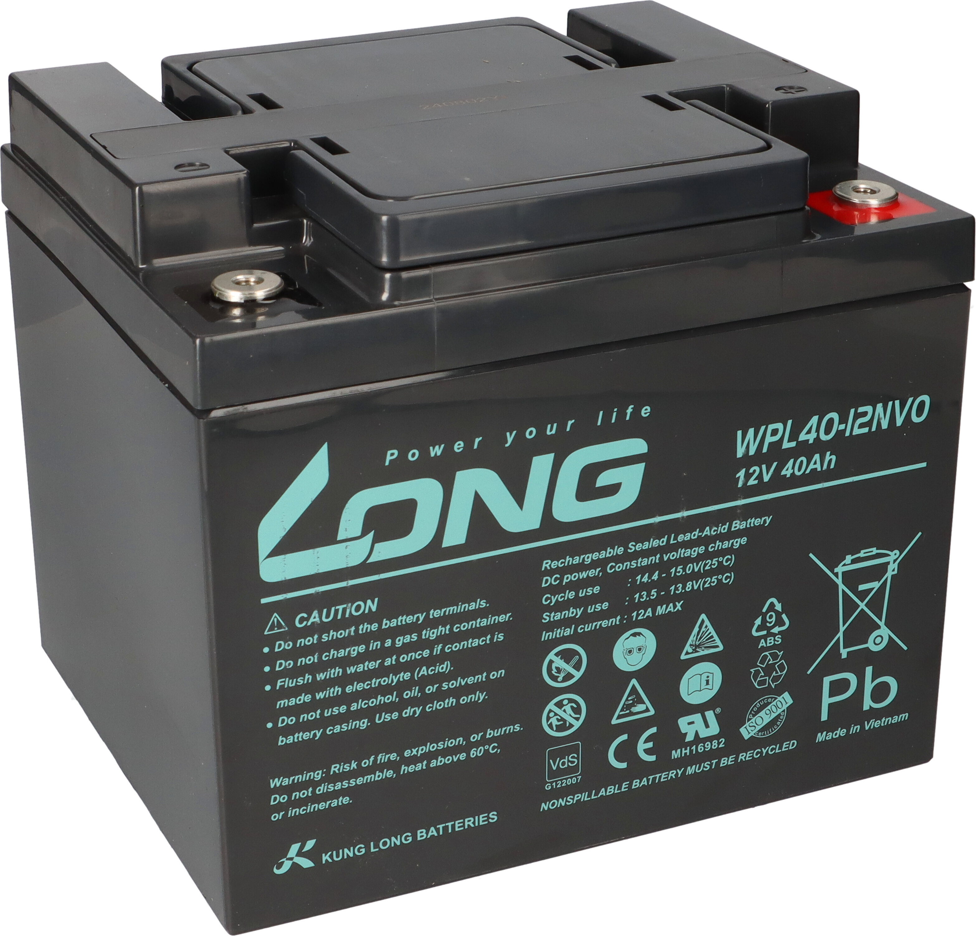 EAN: 4251677391564 - Kung Long WPL40-12NV0 12V 40Ah Pb Batterie Bleigel AGM Langlebige und zuverlässige Kung Long WP40-12 VDS12V 45Ah Bleigel AGM BatterieDie Kung Long WP40-12NV0 VDS12V 40Ah Pb Batterie ist eine langlebige und zuverlässige Bleigel AGM Batterie, die für eine Vielzahl von Anwendungsbereichen geeignet ist. Mit einer Nennkapazität von 40 Ah und einer Nennspannung von 12 Volt ist diese Batterie ideal für den Einsatz in Not- und Sicherheitsbeleuchtung, Brandmeldetechnik, Alarmtechnik, Industrie, USV-Anlagen, IT/Telekommunikation und gewerblichen Einsätzen.Langlebige und zuverlässige Batterie für den Einsatz in verschiedenen BereichenNennkapazität von 40 Ah und Nennspannung von 12 VoltGeeignet für Not- und Sicherheitsbeleuchtung, Brandmeldetechnik, Alarmtechnik, Industrie, USV-Anlagen, IT/Telekommunikation und gewerbliche EinsätzeHohe Leistungsfähigkeit und Widerstandsfähigkeit gegenüber hohen TemperaturenDie Kung Long WP40-12 VDS12V 40Ah Pb Batterie bietet eine hohe Leistungsfähigkeit und Widerstandsfähigkeit gegenüber hohen Temperaturen. Dank ihrer Bleigel AGM-Technologie ist sie besonders widerstandsfähig gegenüber tiefen Entladungen und bietet eine lange Lebensdauer. Zudem ist sie mit einem Schraubanschluss und M6-Anschluss ausgestattet und hat eine Länge von 198 mm, eine Breite von 166 mm und eine Höhe von 171 mm.Hohe Leistungsfähigkeit und Widerstandsfähigkeit gegenüber hohen TemperaturenBleigel AGM-Technologie für eine lange LebensdauerSchraubanschluss und ... Diese Pb AGM VRLA-Batterie Energy Safe Serie ist eine robuste und langlebige Option für verschiedene Anwendungen, die eine sichere und wartungsfreie Batterie benötigen. Manomano.d e Pb agm VRLA-Batterie Energy Safe Serie 12V 40Ah C20 (FM6)
