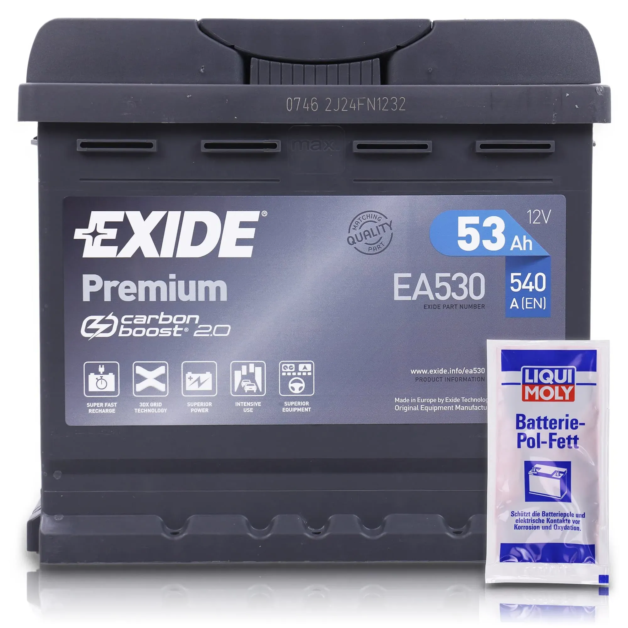 Zustand: Neu - Ladegeräte Ladegeräte für Autobatterien - KIIPO - 10850476 EA530 - EAN: 4055548380844 - 1 - Verkäufer: ATP Autoteile im amazon.de Marketplace Die EXIDE EA530 Premium Carbon Boost Autobatterie bietet mit 53Ah und 540A eine höhere Kapazität und verbesserte Startleistung, ideal für anspruchsvollere Anwendungen. ![]() ![]() kiipo EXIDE EA530 Premium Carbon Boost Autobatterie 12V 53Ah 540A Starterbatterie PKW KFZ Batterie - Ersetzt 45 46 47 48 50 Ah + 1x Batteriepolfett