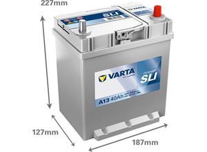 Auto-Zubehör Lifestyle Auto Motorrad - - VARTA Starterbatterie DYNAMIC SLI 12 V, 40 Ah, 330 A Erleben Sie sorgenfreie Ruhe mit der VARTA Dynamic SLI, einer wartungsfreien Batterie, die für zuverlässige Leistung entwickelt wurde. Mit bewährter Technologie bietet sie langanhaltende Leistung und außergewöhnlichen Wert, was sie zur idealen Wahl für herkömmliche Fahrzeuge macht.Kälteprüfstrom EN [A]:330 A Endpolart:3 Breite [mm]:140 mm Bodenleistenausführung B01 Spannung [V]:12 V Höhe [mm]:227 mm Länge [mm]:187 mm Polanordnung 0 Batterie:SLI-Batterie Batterie-Kapazität [Ah]:40 Ah , u.a. für Honda Jazz I (AA), 1232 cm³, 45 PS (33 kW), 2/1984 bis 10/1986, KBA-Nr: 7100418Honda Jazz I (AA), 1232 cm³, 54 PS (40 kW), 9/1984 bis 10/1986, KBA-Nr: 7100421Honda Jazz I (AA), 1232 cm³, 56 PS (41 kW), 10/1983 bis 10/1986, KBA-Nr: 7100417Daihatsu Cuore III (L201), 847 cm³, 41 PS (30 kW), 10/1990 bis 12/1994, KBA-Nr: 7111341Suzuki Alto I (0S), 796 cm³, 39 PS (29 kW), 6/1982 bis 8/1984, KBA-Nr: 7102300Suzuki Alto II, 796 cm³, 39 PS (29 kW), 1/1986 bis 12/1988, KBA-Nr: 7102313Daewoo Tico (KLY3), 796 cm³, 48 PS (35 kW), 2/1995 bis 12/2000, KBA-Nr: 8255300Daihatsu Cuore IV (L501), 847 cm³, 43 PS (32 kW), 1/1995 bis 8/1998, KBA-Nr: 7111348KIA Picanto (TA), 998 cm³, 69 PS (51 kW), ab 5/2011, KBA-Nr: 8253ADRKIA Picanto (TA), 998 cm³, 82 PS (60 kW), ab 5/2011, KBA-Nr: 8253ADVKIA Picanto (TA), 1248 cm³, 85 PS (63 kW), ab 9/2011, KBA-Nr: 8253ADSDaihatsu Cuore IV (L501), 847 cm³, 42 PS (31 kW), 11/1996 ... Die Accurat 12V 46Ah Autobatterie ist eine zuverlässige Starterbatterie, die eine gute Balance zwischen Preis und Leistung bietet. ![]() ![]() Accurat 12V - 46Ah Autobatterie eBay Starterbatterie Batterie KFZ statt 42Ah 44Ah 45Ah