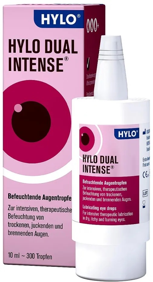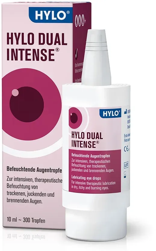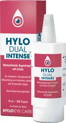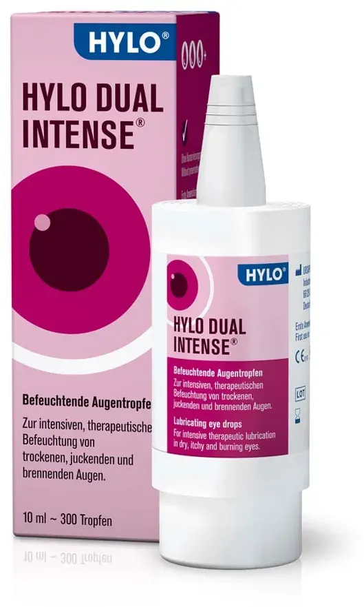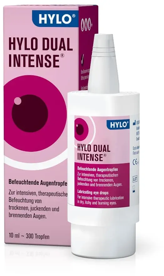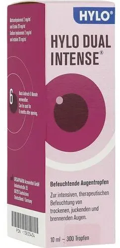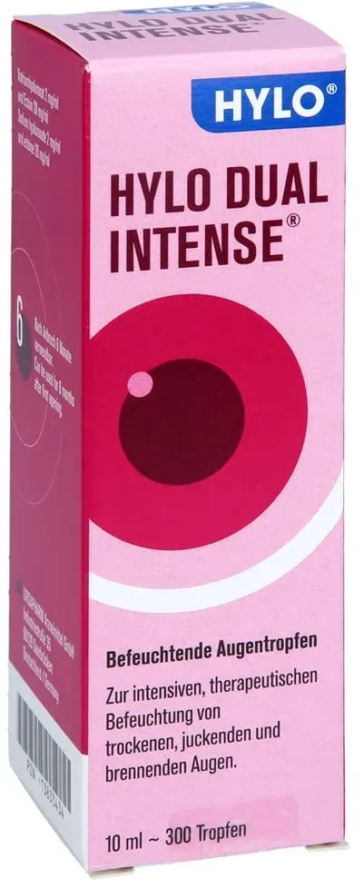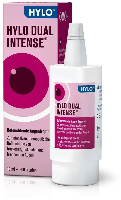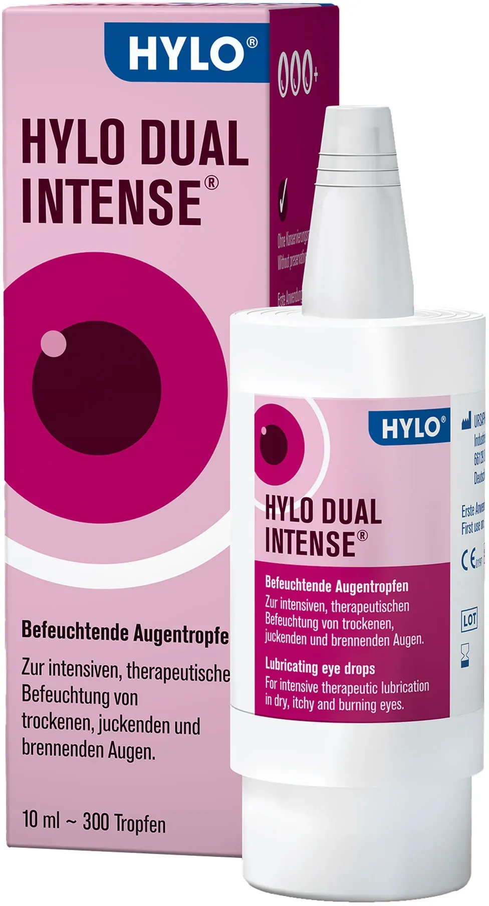 HYLO DUAL INTENSE ? intensive Befeuchtung durch 0,2 % Hyaluronsäure und Ectoin - Intensivtherapie mit 0,2 % Hyaluronsäure und 2 % Ectoin - Intensive und langanhaltende Befeuchtung chronisch trockener Augen mit entzündlicher Symptomatik - Das duale Wirkprinzip aus hochwertiger Hyaluronsäure und Ectoin stabilisiert den Tränenfilm - Langanhaltende Linderung entzündlicher Symptome und Unterstützung der körpereigenen Barrierefunktion gegen entzündliche Reize - Durch die Kombination aus hochviskoser Hyaluronsäure und Ectoin ist die Augenoberfläche vor erneuter Austrocknung geschützt - Hohe Ergiebigkeit durch das patentierte COMOD-System - Frei von Konservierungsmitteln und Phosphaten - 6 Monate nach Anbruch verwendbar Hinweis für Kontaktlinsenträger: HYLO DUAL INTENSE ist aufgrund der hohen Viskosität nicht mit Kontaktlinsen anwendbar. - bei ipill.de - aus Yadore Produktdaten ![]() ![]() URSAPHARM Arzneimittel HYLO DUAL INTENSE 10 ml Augentropfen