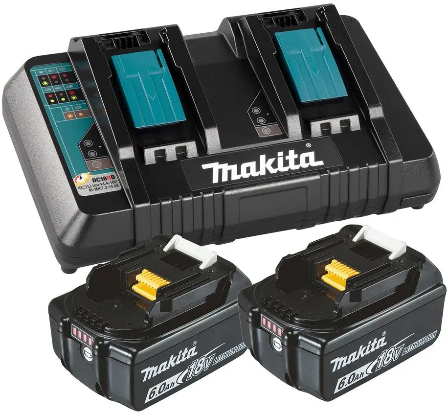 Zustand: Neu - Werkzeugakkus - Makita - 2xBL1860B+DC18RD 196933-6 - EAN: 4250559947257 - Batteriekapazität: 6,0 Ah / 6000 mAh Batteriespannung: 18 V Ladezeit (mit DC 18 RD): ca. 55 Minuten Gewicht: 670 g - 6 Händler im amazon.de Marketplace ![]() ![]() Power Source Kit Li 18V 6Ahx2
