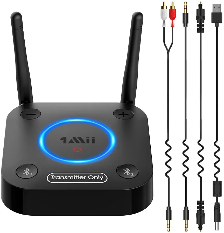 Auf Lager Versand durch Amazon1Mii B06TX Bluetooth 5.2 Transmitter für TV mit aptX HD & Low Latency, großer Reichweite Audio Adapter für 2 Kopfhörer oder Lautsprecher, 3,5mm AUX/Optischer/Koaxialer Ausgang, Lautstärkeregelung