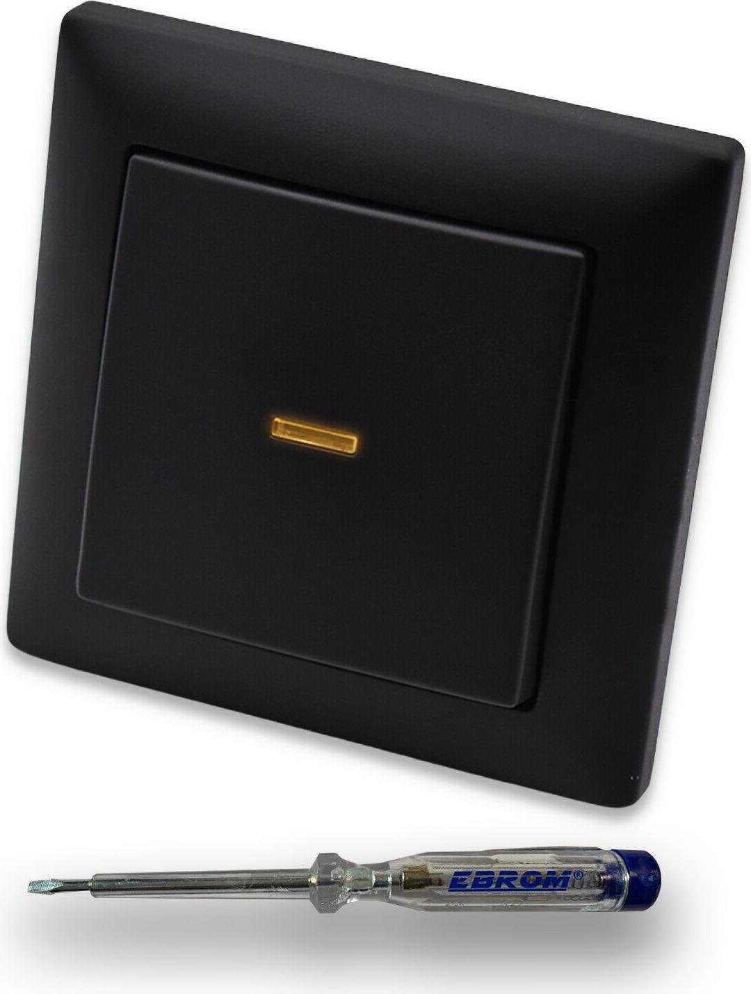 EAN: 4065641648857 - EBROM und BBBlack Wechselschalter beleuchtet SetBUSCH JäGER Wechselschalter 2000/6 USK bietet eine praktische Lösung mit beleuchtetem Kontrolllicht, das sowohl bei eingeschaltetem als auch ausgeschaltetem Zustand sichtbar ist. Durch einfaches Drehen des LED Glimmlampen Einsatzes kann der Zustand geändert werden. Ausgestattet mit einer BBBlack Wippe und einem BBBlack 1fach Rahmen in Schwarz Matt, bietet er nicht nur eine stilvolle Optik, sondern auch eine zuverlässige Leistung.Design und FunktionErleben Sie Design, das berührt: BBBlack Produkte in Schwarz Matt bestechen durch ihre puristische Eleganz und eine zeitlose Formgebung. Die matte Oberfläche unterstreicht die klaren Linien und bietet eine samtige Haptik, während sie gleichzeitig robust gegen tägliche Beanspruchung ist. Dieses Designmerkmal verleiht jedem Raum eine moderne und stilvolle Note, die sich nahtlos in die bestehende Architektur einfügt und gleichzeitig ein starkes visuelles Statement setzt.Exklusive KooperationDie Kooperation zwischen BBBlack und EBROM SET IDEE bringt exklusive Design- und Techniklösungen hervor. Diese spezielle Kombination aus hochwertiger Technik von Busch Jäger und den eleganten, funktionellen Designelementen von BBBlack in schwarz matt ist ein Ergebnis unserer engen Zusammenarbeit. Diese einzigartigen Zusammenstellungen unterstreichen unser Bestreben, innovative und stilvolle Lösungen zu bieten, die nur durch EBROM SET IDEE erhältlich sindLieferumfang und ... Dieses umfassende Set in Schwarz Matt mit BBblack Wippe und Rahmen sowie Phasenprüfer ist perfekt für eine stilvolle und komplette Installation. ![]() ![]() ebrom set idee BUSCH JäGER Wechselschalter - beleuchtet als KONTROLL-LICHT wenn AN oder AUS - 2000/6 USK - mit BBblack Wippe + BBblack Rahmen in Schwarz MATT + EBROM Phasenprüfer zur Montage