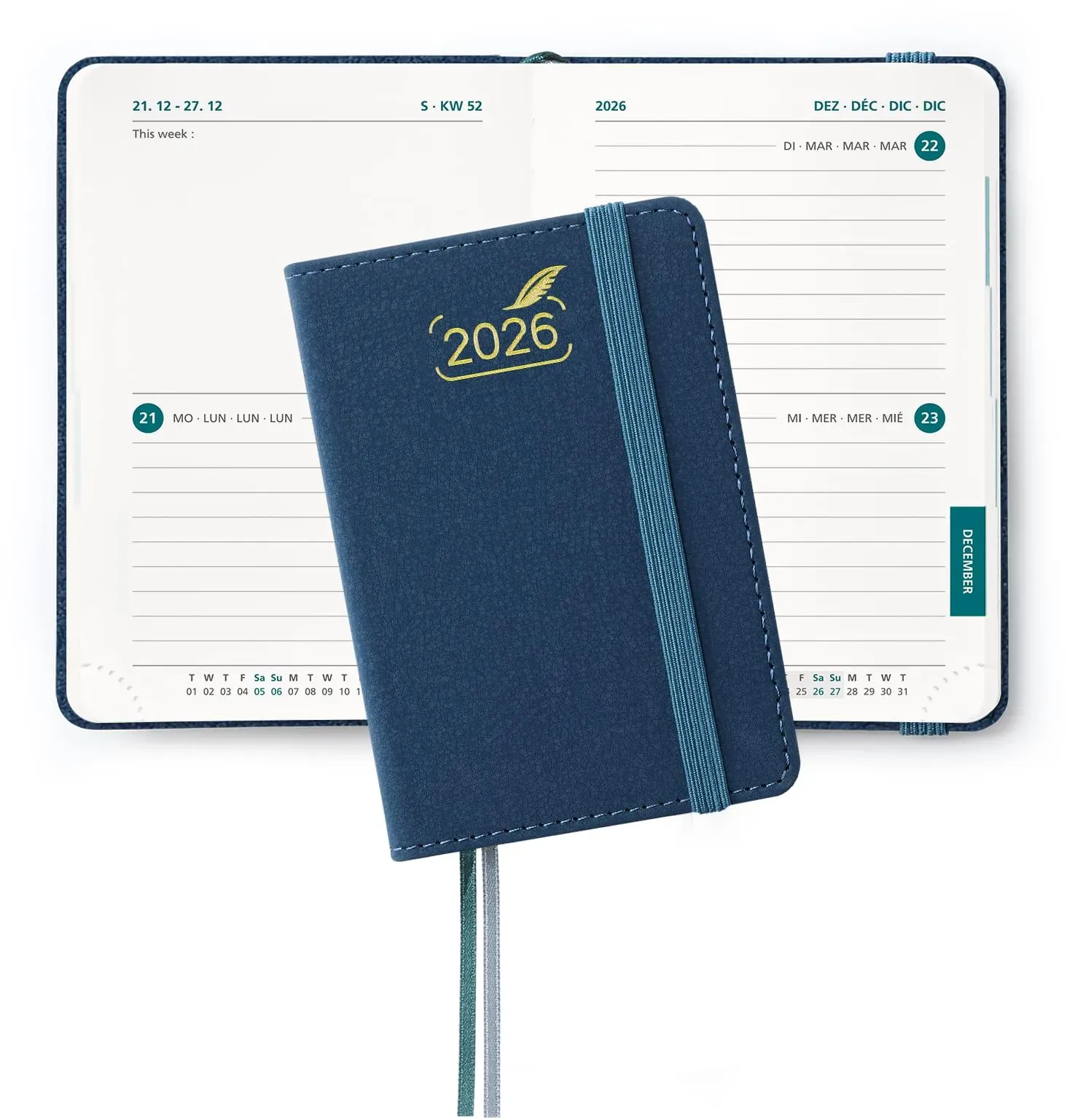 Kategorie: Organizer - 3 Pagen - GTIN:4068456443341 - TASCHENKALENDER 2026: Der 3 PAGEN Taschenkalender 2026 mit 1 Woche auf 2 Seiten ist der perfekte Begleiter für alle, die ihre Termine und Aufgaben immer im Blick behalten möchten, ohne dabei auf Komfort und Stil zu verzichten. Immer dabei und stets up-to-date! Handlicher Taschenkalender in edlem Kunstleder-Einband mit Lesezeichen. ELEGANTES DESIGN UND EDLE AUSFüHRUNG: Der Taschenkalender 2026 besticht durch seine edle Ausführung. Der Kunstleder-Einband sorgt für eine angenehme Haptik und verleiht dem Kalender eine hochwertige Optik. Das schlichte, aber elegante Design in Schwarz macht ihn zu einem stilvollen Accessoire, das zu jeder Gelegenheit passt ob im beruflichen oder privaten Alltag. KOMPAKTES UND PRAKTISCHES FORMAT: Mit einer Größe von nur 8 x 11 cm (A7) ist der Taschenkalender klein und leicht, sodass er problemlos in jede Tasche, Handtasche oder Jackentasche passt. Dieses kompakte Format macht ihn ideal für unterwegs, sodass Sie jederzeit und überall Ihre Termine schnell nachschlagen oder neue Eintragungen machen können, ohne auf ein sperriges Planerformat angewiesen zu sein. üBERSICHTLICHE WOCHENPLANUNG: Ein besonderes Merkmal dieses Taschenkalenders ist die klare und praktische Aufteilung: Eine Kalenderwoche wird auf zwei Seiten dargestellt. Diese übersichtlichkeit ermöglicht es Ihnen, Ihre Woche effizient zu planen, ohne sich in Details zu verlieren. Zudem bietet jede Tagesspalte genügend Platz für die ... Dieser Taschenkalender bietet eine detaillierte Ansicht mit zwei Tagen pro Seite und einem robusten PU-Leder Hardcover. ![]() ![]() BEZEND Taschenkalender 2026 Klein A7 12 x 8 cm - 2 Tage pro Seite - Mini Terminplaner & Buchkalender 2026 mit PU-Leder Hardcover, Preußisch Blau