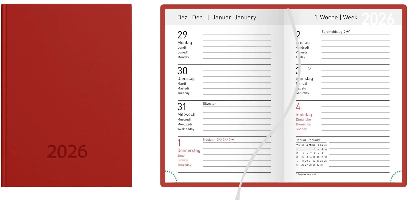 Zustand: Neu - Terminkalender - Idena Iden Berlin - 12055 - EAN: 4064997120550 - Terminkalender im Format DIN A7 für das Jahr 2026, 4-sprachig in Deutsch, Englisch, Französisch und Italienisch 1 Woche auf 2 Seiten: Je Wochentag von Montag bis Sonntag steht eine Spalte mit 6 Zeilen zur Verfügung Der Balaton Einband in Rot ist sehr strapazierfähig und verleiht dem Kalender ein edles Aussehen Inklusive Jahres- und Monatsübersicht, Schulferien, Feiertagen sowie Seiten für Projekt- und Urlaubsplanung und Notizen Insgesamt 168 Seiten aus 80 g/m² FSC zertifiziertem Papier in Weiß mit Leseband und abtrennbaren Ecken - bei Amazon.de Dieser Idena Taschenkalender bietet eine praktische Wochenübersicht auf zwei Seiten und ein ansprechendes Design für 5,49 Euro. ![]() ![]() IDENA 12055 - Taschenkalender DIN A7 2026, 1 Woche auf 2 Seiten, Terminplaner mit Balaton Einband in Rot, Leseband und Eckperforation
