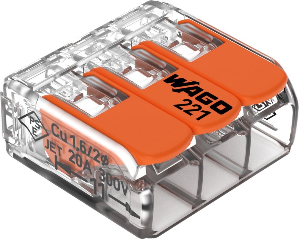Kategorie: Sonstige Elektroinstallationsartikel - WAGO - GTIN:4050821808442 - Produktdetails:Wago Verklemmungsklemmen 50 Stück Modell 221 bis 4mm23-fach Klemme – Zum Verbinden von drei Leitern gleichzeitigSchnelle Installation – Werkzeuglos durch HebelmechanismusUniversell einsetzbar – Für ein-, mehr- und feindrähtige LeiterQuerschnittsbereich: 0,14 mm2 bis 4 mm2 (feindrähtig), 0,2 mm2 bis 4 mm2 (ein- und mehrdrähtig)Doppelte Prüföffnung – Spannung von zwei Seiten messbarDie Wago Verbindungsklemme 3-fach (221-Serie) ermöglicht das sichere und schnelle Verbinden von bis zu drei Leitern mit unterschiedlichen Querschnitten. Der Hebelmechanismus erlaubt eine einfache, werkzeuglose Installation.Mit einem Anschlussbereich von 0,14 mm2 bis 4 mm2 (feindrähtig) und 0,2 mm2 bis 4 mm2 (ein- und mehrdrähtig) sind die Klemmen vielseitig einsetzbar. Dank der zwei Prüföffnungen können Spannungsmessungen auch im eingebauten Zustand mühelos durchgeführt werden.Diese Klemmen eignen sich hervorragend für Elektroinstallationen im Haus, Verteilerkästen, Schaltschränke oder industrielle Anwendungen.Lieferumfang:Wago Verbindungsklemmen 50 Stück Modell 221 bis 4mm2 3-fach Innovative Verbindungslösung für Ihre ElektroinstallationEigenschaften & VorteileDie Verbindungsklemme mit Hebeln für 3-Leiter überzeugt durch ihre einfache Handhabung und hohe Sicherheit. Dank der transparenten Gehäusekonstruktion ist die Kontrolle der Leitereinführung jederzeit möglich. Die Hebeltechnik ermöglicht ... Ein weiteres Angebot für 50 Stück, das eine solide Menge für den regelmäßigen Gebrauch bietet. ![]() 50 Stk. WAGO GmbH & Co. KG Compact-Verbindungsklemme 221-413