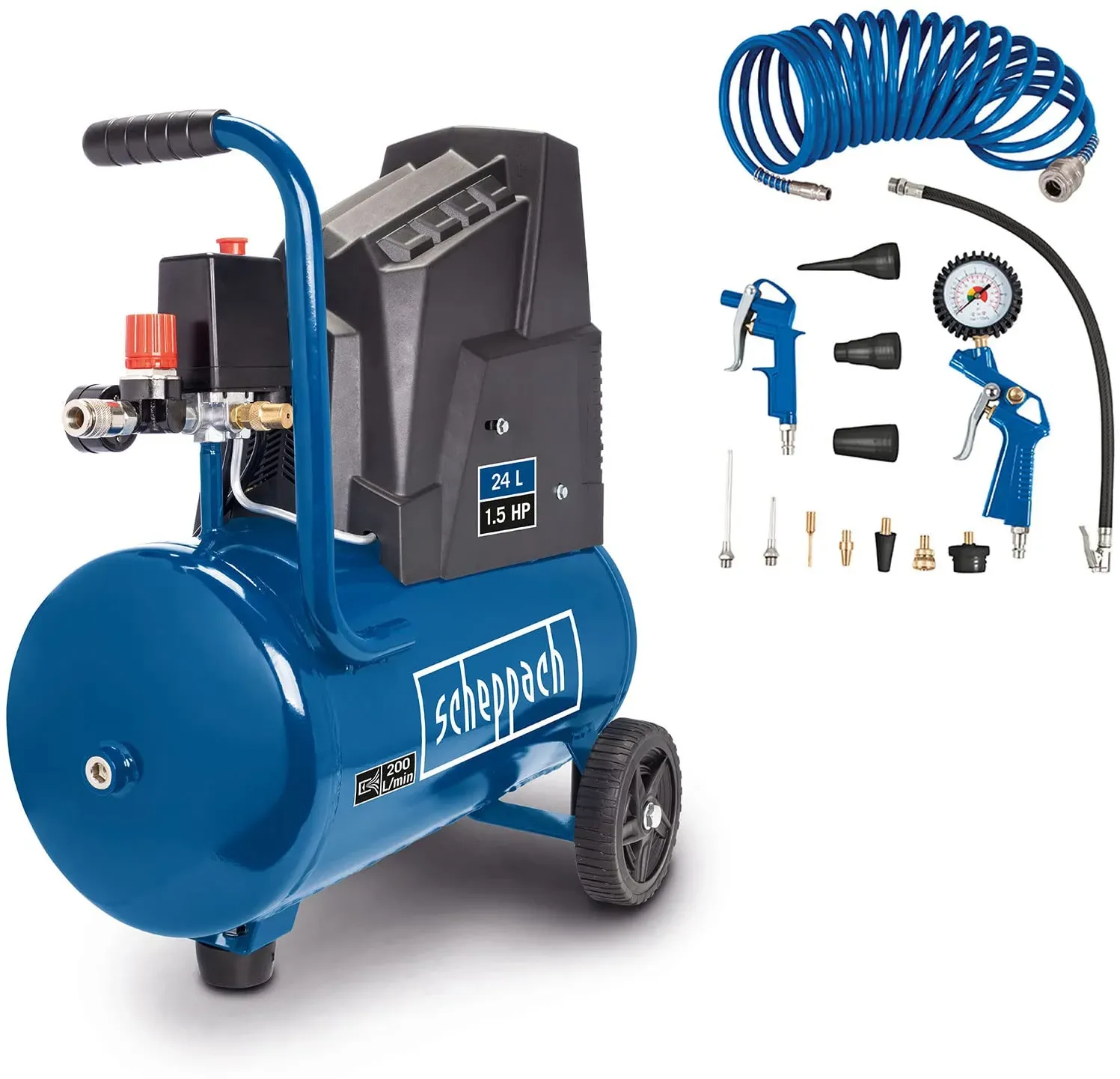 9 Händlerangebote bei billiger.de - Kategorie: Kompressoren - SCHEPPACH - Mit seinem 24-Liter-Kessel, einem Arbeitsdruck von 8 bar und umfangreichem Zubehör deckt der HC30O von Scheppach viele Anforderungen rund ums Haus und in der Werkstatt ab. Als ölfreier Kompressor ist er besonders wartungsarm. Die Fahrvorrichtung und der Spiral-Druckluftschlauch sorgen für einen komfortablen Arbeitsradius, leichten Transport und eine ordentliche Lagerung. - GTIN:4046664137788 ![]() ![]() Scheppach Kompressor HC25o (1100W, 24 L,8 bar, Ansaugleistung 165 l/min, Druckminderer, ölfrei) - inkl. 13-teiligem Druckluft-Werkzeug-Set + 5 m Spiralschlauch