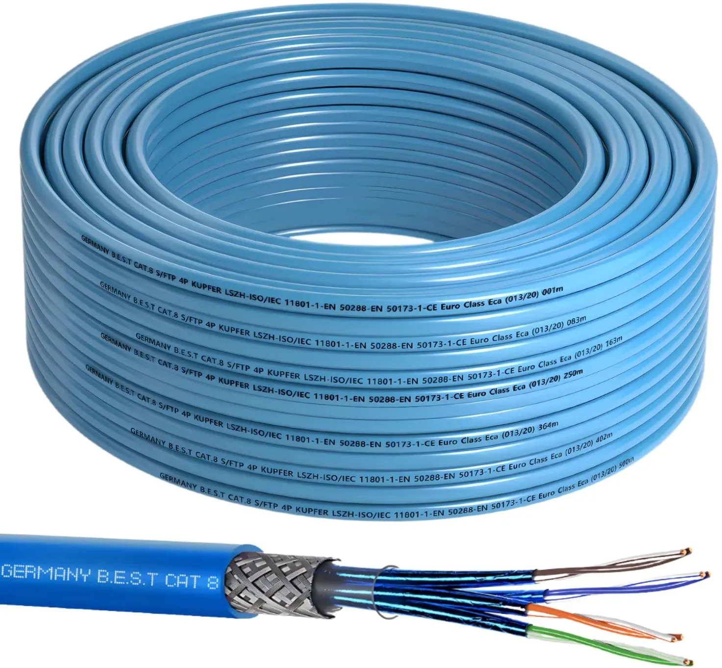 Kategorie: Netzwerkkabel - germany b.e.s.t - GTIN:4260443576517 - Höchste übertragungsgeschwindigkeit mit bis zu 40 Gbit/s | Cat 8 / Cat 8.1 Verlegekabel (Class I, Class II) Ethernet LAN Kabel mit 2000 MHz Bandbreite ideal für ultraschnelles Highspeed-Internet, Glasfaser-Anbindungen, Rechenzentren, Data Center, Backbone-Verbindungen sowie professionelle IT-Netzwerke Zukunftssichere strukturierte Gebäudeverkabelung im Innenbereich | Perfekt geeignet für Netzwerkdosen, Patchfelder, Serverschränke, 19 Zoll Racks, Keystone Module, Switches, Router, Access Points, Modems, Media Converter, NAS-Systeme, Workstations und mehr optimal für Gigabit, 10G, 25G und 40G Netzwerke Exzellente Signalqualität und maximale Störsicherheit | Dank hochwertiger S/FTP-Doppelschirmung (Aluminiumfolie um jedes Adernpaar + zusätzliches ALU-Geflecht) wird eine extrem störungsfreie und verlustarme Datenübertragung gewährleistet schützt effektiv vor elektromagnetischen Störungen (EMI), Crosstalk und Signalverlust Premium-Kabelaufbau für höchste Leistungsfähigkeit | Reine Kupfer-Massivleiter (AWG 23/1, solid, 8-adrig, 4x2 Twisted Pair) für langlebige und stabile Verbindungen unterstützt PoE, PoE+, PoE++, IPv6, VoIP-Telefonie, Videoüberwachung (CCTV), Smart-Home-Lösungen, Cloud-Anwendungen und anspruchsvolle Enterprise-Netzwerke Besonders langlebig und leistungsstark | Cat.8 Verlege-Netzwerkkabel mit robuster Außenummantelung für dauerhafte Installation in Wänden, Kabelkanälen, Unterputzdosen und ... Das KASIMO CAT 8 Lan Kabel ist eine gute Wahl für superschnelle und robuste Internetverbindungen mit vergoldeten RJ45-Steckern. ![]() ![]() KASIMO CAT 8 Lan Kabel 25meter Netzwerkkabel Cat 8 Für 40Gbps / 2000Mhz Ethernet Kabel, Internet Patchkabel Superschnell Flexibel und Robust mit vergoldetem RJ45. Lan kabel 25m Schwarz