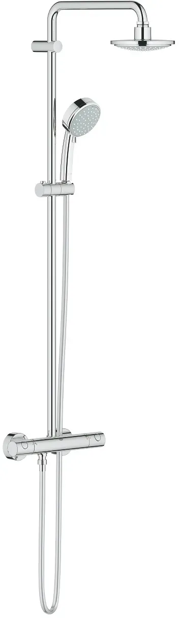 GROHE - EAN: 4005176923364 - Tempesta Cosmopolitan System 160Duschsystem mit Thermostatbatterie für die Wandmontage bestehend aus:horizontal schwenkbarer 390 mm Brausearm Aufputz-Thermostat mit Aquadimmer Funktion ermöglicht den Wechsel zwischen:Kopfbrause 160 1 Strahlart (28 232) Strahlart: Rainmit Kugelgelenk, Drehwinkel 15 Handbrause Tempesta C 100 (27 571) 2 Strahlarten: Rain, Jetin der Höhe verstellbar mittels GleitelementSilverflex Brauseschlauch 1.750 mm 1/2'' x 1/2'' (28 388)GROHE TurboStat Kompaktkartusche mit Dehnstoff-ThermoelementGROHE SafeStop Sicherheitssperre bei 38 CGROHE SafeStop Plus optional einsetzbarer Temperaturendanschlag bei 43 CGROHE DreamSpray Perfektes StrahlbildGROHE Long-Life OberflächeSpeedClean Antikalk-SystemInnenliegende separate WasserführungTwistStop gegen Verdrehen des Brauseschlauchsfür Durchlauferhitzer ab 18 kW/h geeignet Mindestdurchfluss 7 l/minoptionales Zubehör: GROHE EasyReach Ablage (26 362) - bei heizung-billiger.de - aus Yadore Produktdaten ![]() ![]() GROHE New Tempesta Cosmopolitan System Duschsystem mit Thermostatarmatur Chrom 27922000