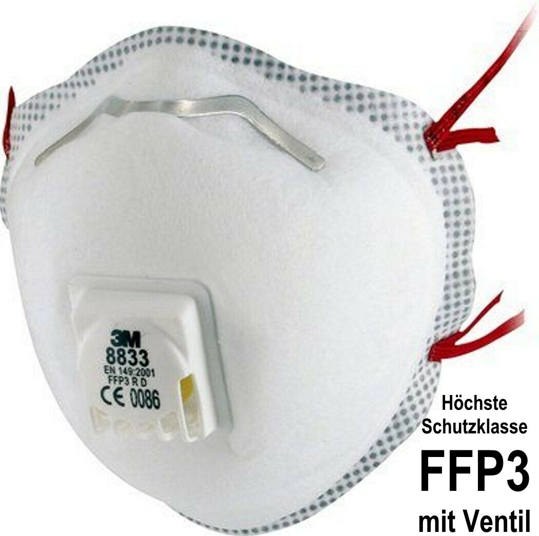 Zustand: Neu - Einweg-Staubschutzmasken in Schalenform Gewölbte Staubschutzmasken - 3M - 7100057145 - EAN: 4046719975747 - Einweg-Atemmaske P3 bietet einen zuverlässigen, effektiven Schutz vor hochfeinem Feinstaub, Nebel und Metallrauch Die Becherform, doppelte Banddesign, Nasenschaum und Nasenclip machen es angenehm, über eine Vielzahl von Gesichtsgrößen zu tragen 3m Kühlfußventil reduziert Wärme und Feuchtigkeitsansammlung und bietet Arbeiter mit einem angenehmen Schutzniveau - auch bei heißen und feuchten Bedingungen zähe äußere Hülle für zusätzliche Haltbarkeit Superweiche gepolsterte Innenfutter für Komfort - Verkäufer: epic.gadgets im amazon.de Marketplace Dieses Angebot ist mit 38.98 Euro für 10 Masken eine gute Option für den Kauf einer größeren Menge. ![]() ![]() 3M Atemschutzmaske - 8833, FFP3 eBay R D - 10 Stück - 7100057145