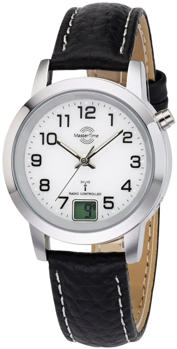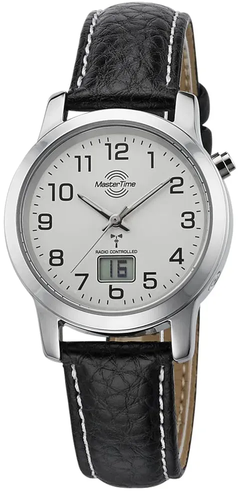 12 Händlerangebote bei billiger.de - Kategorie: Damenuhren - Master Time - Metallgehäuse mit Edelstahlboden, Mineralglas, wasserdicht geprüft bis 3 bar, Durchmesser 34 mm, Höhe 10,6 mm, schwarzes Lederband mit Dornschließe, 3-Zeiger-Funkwerk, Langzeitbatterie, empfängt das Zeitsignal DCF77 aus Mainflingen, Deutschland, automatische Zeitumstellung, Anzeige von Datum und Wochentag, ewiger Kalender, weißes Zifferblatt, lumineszierende Zeiger und Markierungen - GTIN:4260091353874 ![]() ![]() Master Time - MTLA-10295-12L Funk eBay Basic Damen Uhr Funkuhr Ø 34mm Schwarz/Silber
