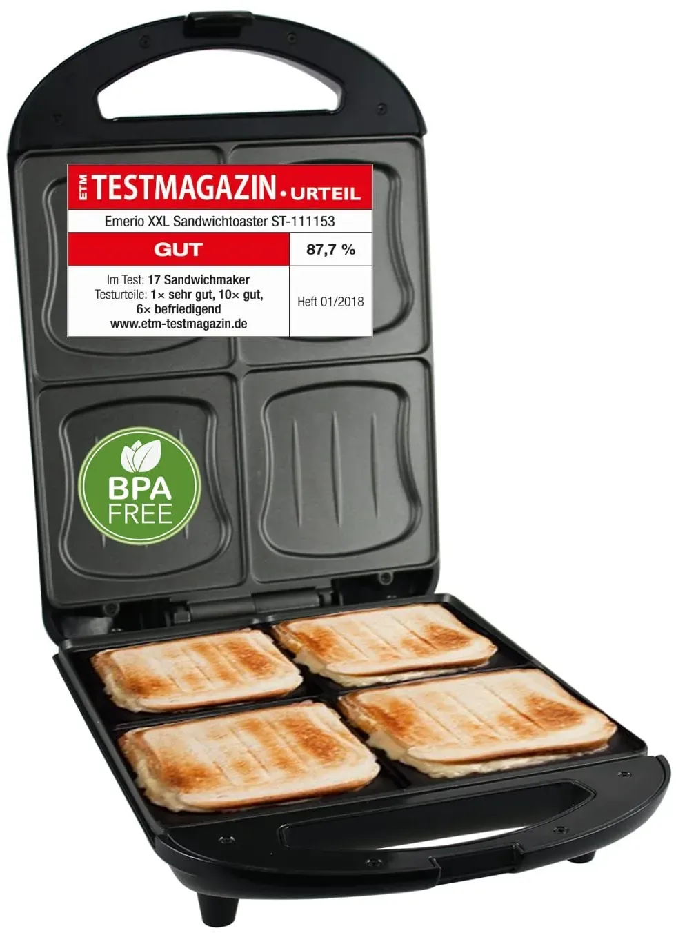 Zustand: Gebraucht - Sandwich- & Paninitoaster - Emerio - ST-111153.4 - EAN: 7333282008024 - 1300 Watt XXL Sandwichtoaster / Sandwichmaker für alle Toast-Größen, auch für American Style Sandwich-Toastscheiben geeignet Muschelformat: damit der Käse innen bleibt und nicht außen verschmiert Thermostat für automatische Hitzeverteilung für ideale Ergebnisse Beste antihaftbeschichtete Druckguss-Platten zur schnellen und einfachen Reinigung Ausgezeichnet vom ETM Testmagazin mit Endnote GUT | Ausgabe 01/2018 - 7 Händler im amazon.de Marketplace Dieser Sandwichmaker ist mit seinem sehr günstigen Preis und der Kapazität für 8 Sandwichecken eine praktische Option für den kleinen Geldbeutel. ![]() ![]() 4er Sandwichmaker | 1200 Watt | 8 Sandwichecken | Cool-Touch-Gehäuse | Antihaftbeschichtung | Sandwichtoaster | Sandwich Makerx | Elektrogrill | Paninitoaster