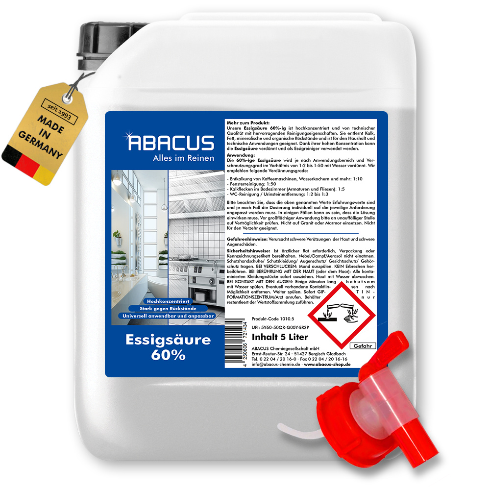 EAN: 4250606721458 - Essigsäure 60%Vorteile auf einen BlickVielseitig einsetzbar im Haushalt, Garten, Hobby und GewerbeKraftvoll gegen Kalk, Fett, Urinstein, Seifenreste und GerücheIdeal als Reiniger für Küche, Bad, Fenster und BödenPerfekt für Gartenpflege, Steinflächen, Terrassen und AußenbereicheHochkonzentriert und individuell verdünnbarUmweltfreundliche Alternative zu chemischen ReinigernEssigsäure 60% Mehr zum ProduktDie ABACUS Essigsäure 60% ist eine leistungsstarke und hochkonzentrierte Essigsäure für vielfältige Anwendungen in Haushalt, Industrie und Außenbereich.Sie eignet sich ideal als Essigreiniger, Entkalker, Fensterreiniger oder für die Gartenpflege besonders dann, wenn kraftvolle Reinigung gefragt ist. Kalk, Fett, Seifenreste, Urinstein und unangenehme Gerüche werden effektiv entfernt ohne aggressive oder umweltschädliche Inhaltsstoffe.Im Garten und Außenbereich ist die Essigsäure ein bewährtes Mittel zur Reinigung von Steinflächen, Terrassen, Gartenwegen und Möbeln. Auch zur nachhaltigen Pflege von Außenanlagen wird sie gerne eingesetzt, da sie eine umweltschonende Alternative zu chemischen Produkten und Pestiziden bietet.Dank der 60%-igen Konzentration ist die Essigsäure äußerst ergiebig und kann bedarfsgerecht verdünnt werden. Ein Kanister ersetzt mehrere herkömmliche Reiniger und spart Lagerplatz sowie Kosten. Ideal für große Flächen und professionelle Anwendungen.Die Herstellung erfolgt am ABACUS-Standort in Bergisch Gladbach nahe Köln mit über 3 n ... Dieses 20-Liter-Angebot (4x 5L) ist eine gute Option für größere Mengen zu einem attraktiven Preis. ![]() ![]() PTS GmbH Essigsäure 60% | 20 Liter (4 x 5 L) | Entkalker | Essig | Reiniger | technisch
