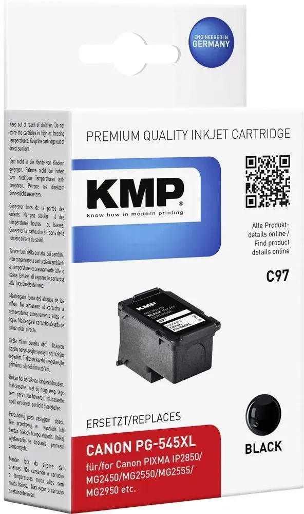 19 Händlerangebote bei billiger.de - Kategorie: Druckerpatronen - KMP - Ob Tintenpatronen, Toner, Farbbänder, Thermo-Transferbänder oder Papiere die kompatiblen Produkte von KMP bieten allerhöchste Qualität überzeugen Sie sich! Warum KMP? Die Tinten und Toner von KMP passen perfekt, sind mindestens genauso farbintensiv und glänzen mit einem unschlagbaren Preisvorteil gegenüber den Tinten und Tonern der Originalhersteller. Entscheiden Sie sich mit gutem Gewissen für KMP! In Sachen Qualität und Leistungen wollen wir keine Kompromisse eingehen. Egal ob wiederverwertete Tintenpatrone oder clevere Neuentwicklung, das Ziel für unsere Produkte ist immer gleich: 100 Prozent kompatibel und so gut wie das Original zu einem attraktiven Preis. Ink Engineered in Germany : Qualität auf höchstem Niveau Das Original ist unser Maßstab. Daher werden für nahezu jeden neuen Patronentyp die einzelnen Farben in den KMP-Labors neu entwickelt. Für die Auswahl der Rohstoffe gibt es strenge Qualitätsmaßstäbe. Die Entwicklung aller Tinten findet an der deutschen Firmenzentrale statt, die Produktion an hauseigenen Standorten in Europa. Manufactured in Europe: Flexible Fertigung Alle Produkte von KMP werden in Europa hergestellt. Unsere Ansprüche an die Qualität und die Verfügbarkeit der KMP-Produkte sind enorm. Wir produzieren ausschließlich in Europa und unser Werk in Tschechien ist mit einer der modernsten Tintenabfüllstraßen ausgestattet. So können wir kurzfristig auf die Nachfrage im Markt reag - ... Diese KMP C97 schwarze Druckkopfpatrone ist eine kompatible und preisgünstige Alternative zur Originalpatrone. Bueroshop2 4.de KMP C97 schwarz Druckkopf kompatibel zu Canon PG-545 XL