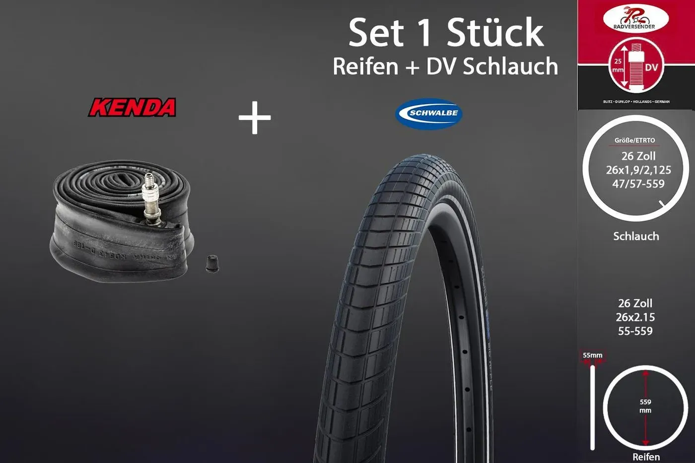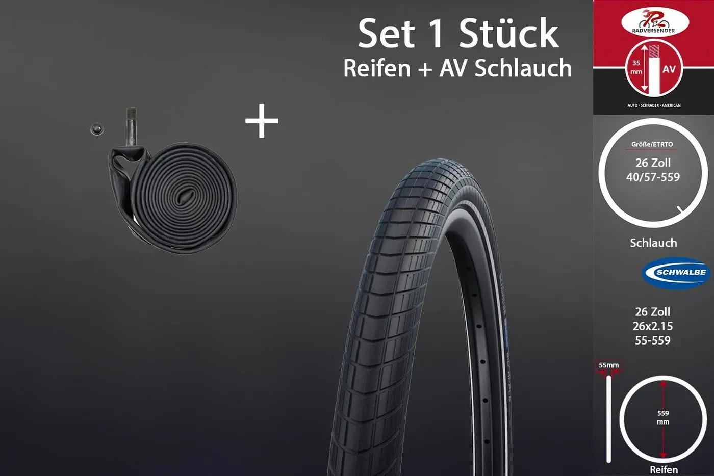 ![]() ![]() Schwalbe Fahrradreifen 26 Zoll Reifen Set 26x2.15 Schwalbe Big Apple 55-559 mit DV Schlauch, (2-tlg), Reflexstreifen,Pannenschutz schwarz