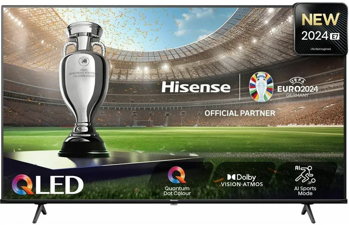 HISENSE - EAN: 6942351402802 - E7KQ PRO - Ins nächste Level mit QLED 4KQuantum Dot ColorQuantum Dot Color steht für präzise Kontraste und höchste Farbbrillanz. Das perfekte Zusammenspiel aus der Hi View Engine, basierend auf einem Quad Core Prozessor und Quantum Dot Technologie sorgt für erweitertes Farbvolumen, Detailreichtum und Spitzenhelligkeiten.Dolby Vision IQDolby Vision gehört zu den höchsten HDR Formaten. Es verstärkt die Fernseheinstellungen, sodass feinere Details selbst in dunklen Szenen sichtbar werden. Mit IQ berechnet der Fernseher die Helligkeit im Raum mit ein für ein atemberaubendes Filmerlebnis.SprachassistentenHöchsten Komfort bieten die Sprachassistenten Alexa Built-In oder VIDAA Voice, die per Knopfdruck auf der Fernbedienung gerne Ihre Befehle entgegen nehmen.Game Mode Pro 144 Hz, Freesync Premium & Game BarFür Gamer bietet der Game Mode Pro pures Spielvergnügen mit HDMI 2.1 Unterstützung (144Hz@4K). Mittels ALLM schaltet der Fernseher in Verbindung mit der Spielekonsole automatisch in den Game-Modus mit der geringsten Latenz. Freesync sorgt für eine dynamische Anpassung der Bildwiederholfrequenz an die Aktualisierungsrate von Videoinhalten für eine stromsparende und ruckelfreie Videowiedergabe.UHD AI UpscalerDie UHD AI Upscaling Technologie optimiert das FHD-Signal auf nahezu 4K-Qualität. Anstatt einfach jedes Pixel 4-fach hochzurechnen, analysiert die Hisense UHD AI Upscaling Technologie das Farbangrenzender Pixel und optimiert die Farbgebung Szene ... ![]() Hisense TV 55E77NQ Pro (55', QLED, 4K, 2024), TV, Schwarz