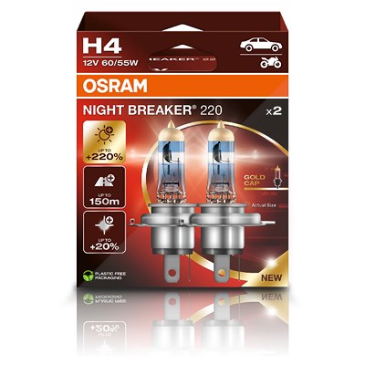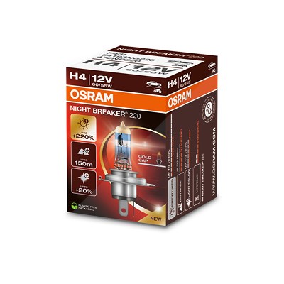 OSRAM - EAN: 4062172399449 - Lampenart: H4; Spannung [V]: 12; Nennleistung [W]: 60/55; Sockelausführung Glühlampe: P43t; Gebindeart: Schachtel; Menge: 1; Leuchten-Bauart: Einfachscheinwerfer, Halogen, Dreifachscheinwerfer; Baujahr ab: 05/1991, 01/1989, 09/1999, 10/1999,... - bei autodoc.de - aus Yadore Produktdaten Ein attraktives Angebot für eine einzelne Lampe mit der beworbenen 220% mehr Helligkeit. ![]() ![]() Osram NIGHT BREAKER 220, H4, 220% mehr Helligkeit, Halogen-Scheinwerferlampe, 64193NB220, Faltschachtel (1 Lampe)
