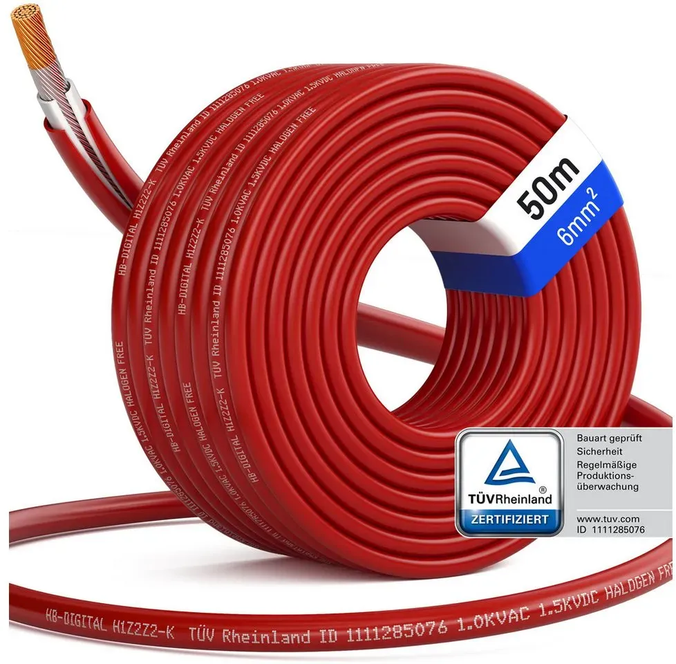lieferbar-in 2-3 Werktagen bei dirHB-DIGITAL Solarkabel 6mm2 Solarleitung H1Z2Z2-K Photovoltaik PV Kabel Solarkabel, Solarstecker, (5000 cm), TüV Rheinland zertifizierte PV Kabel rot