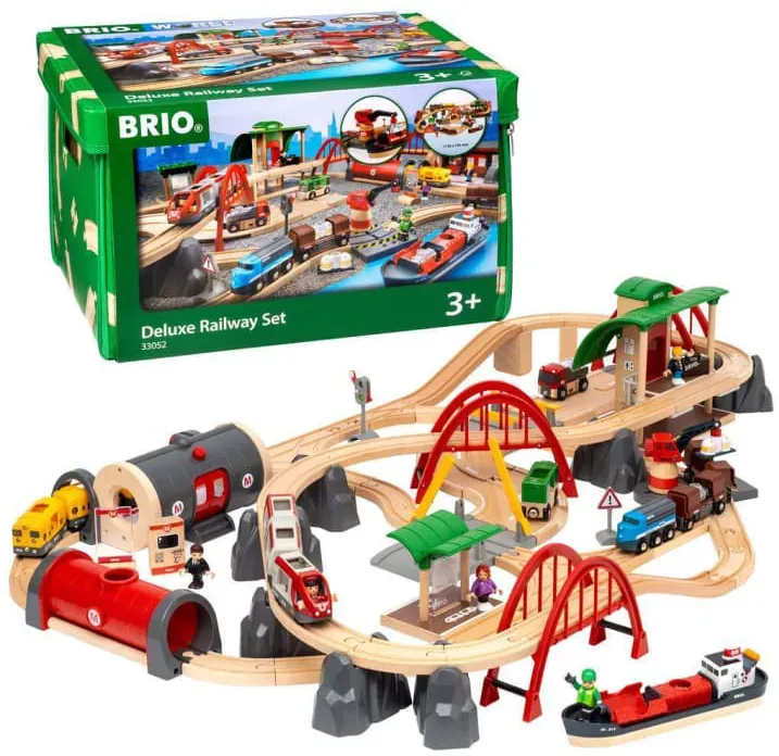 Kategorie: Holzspielzeug - BRIO - GTIN:7312350330526 - So viel BRIO Bahn-Welt auf Straßen & Schienen wie noch nie! Ein Aufbau voller Action, einschließlich Reisezug, Frachtzug, Hafenszenen und Metro-Spaß, komplett mit Bahnhöfen, Kränen, Brücken und Figuren. Ein Muss für alle Eisenbahn-Fans! Deine Fantasie bestimmt Dein Ziel.über BRIO World: BRIO World ist unser offenes Spielsystem, das mit Ihrem Kind mitwächst. Alle Spielzeuge von BRIO World lassen sich miteinander kombinieren, um eine vollständig anpassbare Welt zu erschaffen, die sich hervorragend zum Herausfodern wachsender Köpfe eignet. Es gibt unzählige Kombinationen für fantasievolles Spielen, die darauf warten, entdeckt zu werden, und dieses Spielset passt perfekt dazu nehmen Sie einfach ein Teil in die Hand und starten Sie mit dem Bau Ihrer Welt. das 33052 Deluxe-Eisenbahnset enthält 87 Teile: 1x Frachtschiff, 4x Frachtladungen, 2x Fahrzeuge, 2x Güterwagen, 1x Güterzug, 3x U-Bahn-Wagen, 3x Reisezugwagen, 3x Bahnhöfe, 1x U-Bahn-Tunnel und vieles mehr. - 329,99 Euro bei Thalia.de - gefunden von billiger.de ![]() ![]() Brio-Deluxe-Set
