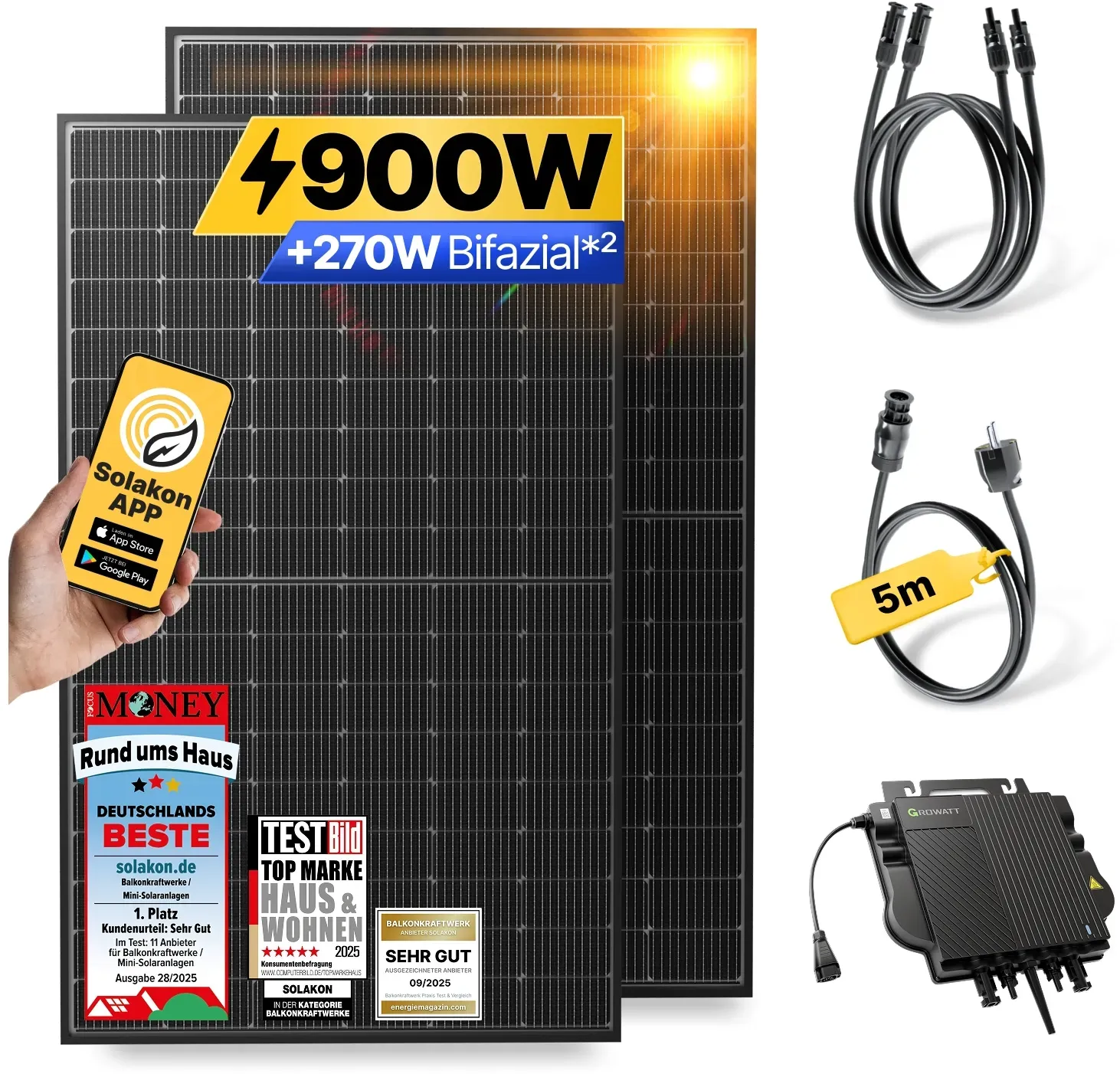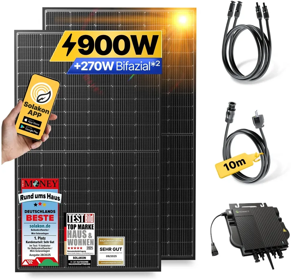 Anmeldung und rechtliche AspekteWichtig: In Deutschland musst du dein 800W Balkonkraftwerk offiziell anmelden. Bis 600W erfolgt dies über ein einfaches Formular beim Netzanbieter.[5] Seit Mai 2024 gelten neue Regelungen durch das Solarpaket I, die mehr Watt und weniger Bürokratie ermöglichen.[4] StromersparnisBei optimalen Standortbedingungen kann eine jährliche Stromkostenersparnis von bis zu 390 Euro erreicht werden (bei 40 Cent/kWh Strompreis).[9] Viele Systeme amortisieren sich bereits nach wenigen Jahren.[2] Fazit für deine KaufentscheidungWähle ein Komplettset mit bifazialen Modulen im Preisbereich 300-500 Euro von etablierten Herstellern. Achte auf flexible Halterungssysteme, ausreichende Kabellänge und einen zuverlässigen Wechselrichter. Die Installation ist kinderleicht und ohne Fachpersonal möglich - ideal auch für Anfänger ohne technische Vorkenntnisse. Jetzt live Suche nach 800w balkonkraftwerk steckerfertig starten! Empfohlene 800w balkonkraftwerk steckerfertig Angebote*Durch Kufe ber Links zu Hndlern kann diese Website eine Provision erhalten, u.a. durch das eBay Partner Network und das AmazonPartnerNetHier ist eine Auswahl von 15 repräsentativen und empfehlenswerten Balkonkraftwerken mit 800W, die steckerfertig sind: Dieses Solakon Balkonkraftwerk bietet mit 900W/800W eine gute Leistung zu einem sehr attraktiven Preis und ist ideal für Einsteiger. ![]() ![]() solakon Balkonkraftwerk 900W/800W Solaranlage Steckerfertig WIFI Komplettset Photovoltaik Anlage 800W, Kabellänge: 5m