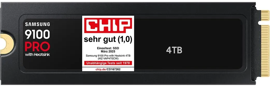 31 Händlerangebote bei billiger.de - Kategorie: SSD Festplatten - Samsung - Next Level Drive: PCIe 5.0 NVMe SSD mit Heatsink für High-End-Gaming auf Playstation 5 oder PC / Steam Deck, 4K-Video- und 3D-Bearbeitung und mehr, Bis zu 2-mal schneller als die 990 PRO Atemberaubende Geschwindigkeit dank PCIe 5.0: Sequentielle Lese-/Schreibgeschwindigkeiten von bis zu 14.800 MB/s bzw. 13.400 MB/s, Zufällige Lese-/Schreibvorgänge von bis zu 2.200K/2.600K IOPS1 2 3 Innovatives Leistungs- & Wärmemanagement: Fortschrittliche 5-nm-Controller-Power-Architektur für eine bis zu 49 % bessere Energieeffizienz im Vergleich zur 990 PRO4, Beeindruckendes Wärmemanagement Speicherkapazitäten von bis zu 8 TB im kompakten M.2-Formfaktor (2280), Next-Level-Performance für PS5, leistungsstarke (Gaming-)PCs und Notebooks/Ultrabooks Einfache Laufwerksverwaltung: Mit nutzungsfreundlicher Samsung Magician Software für Laufwerk-Updates und Leistungsoptimierung5 Lieferumfang: 1 x Samsung 9100 PRO NVMe M.2 SSD mit Heatsink, Speicherkapazität: 4 TB, MZ-VAP4T0CW - GTIN:8806095811659 Direkt vom Hersteller Samsung, bietet dieses Angebot die 4 TB SSD zu einem fairen Preis. ![]() ![]() Samsung 9100 PRO Heatsink PCIe 5.0 NVMeTM M.2 SSD - 4 TB Schwarz