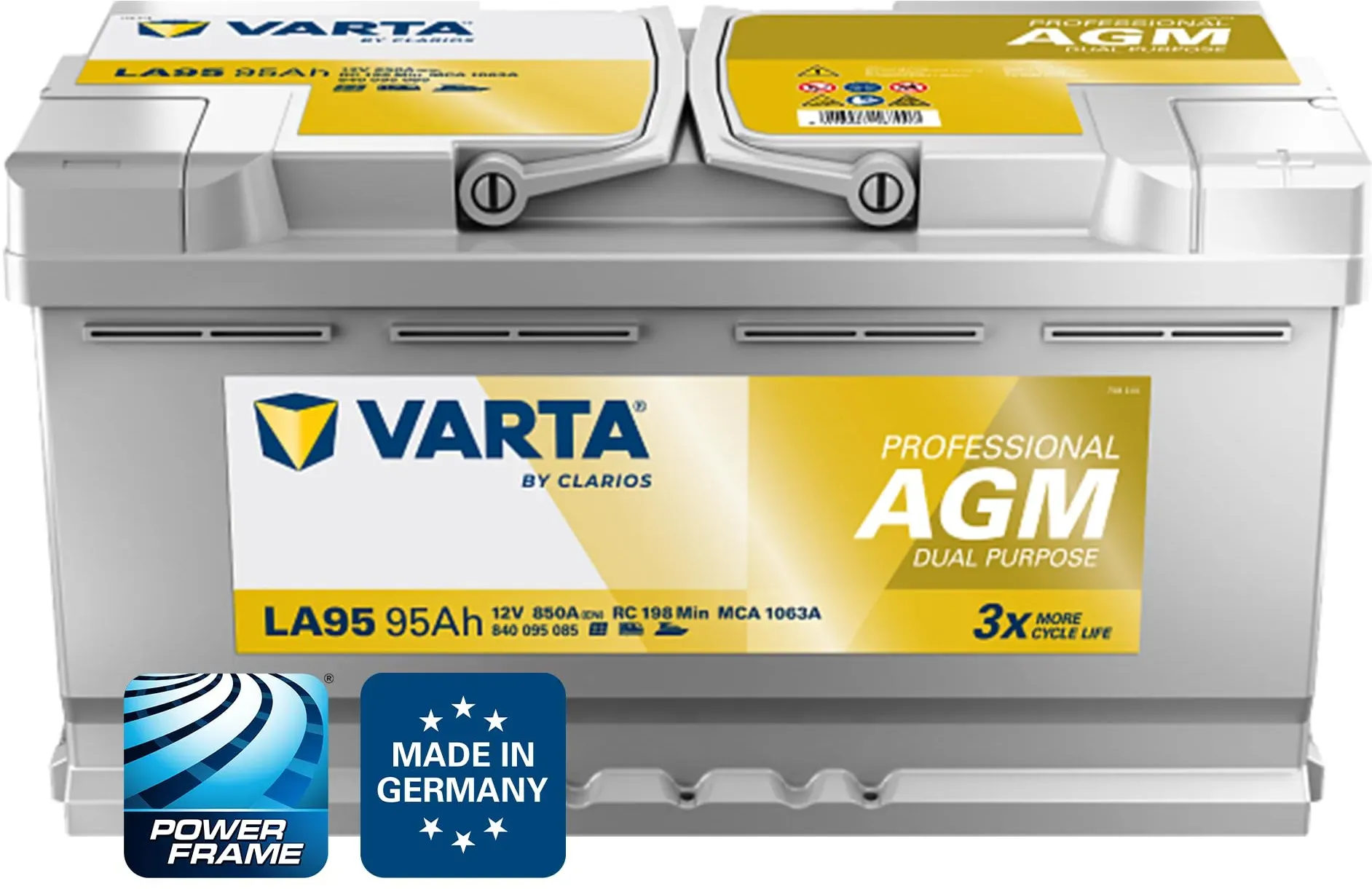 Kategorie: Caravan-Zubehör - Varta - GTIN:4016987167007 - FüR OFF-GRID ABENTEUER: Die Professional AGM-Batterie ist darauf ausgelegt, längere Off-Grid-Abenteuer zu unterstützen und bietet außergewöhnliche Leistung und Zuverlässigkeit über längere Zeiträume. Ideal für Fahrzeuge mit hohem Energiebedarf DUAL-PURPOSE POWER: In Freizeitanwendungen mit erhöhtem Energiebedarf können diese Batterien zum Starten von Motoren oder für die Versorgung von Zubehör und Elektronikprodukten verwendet werden. Mit minimaler Selbstentladung und daher auch ideal für den saisonalen Gebrauch BIS ZU DREIFACHER ZYKLENLEBENSDAUER: Dank patentierter PowerFrame-Technologie werden eine schnelle Ladefähigkeit und eine höhere Korrosionsbeständigkeit gesichert. Die Batterie besitzt eine 3-fache Zyklenlebensdauer im Vergleich zu konventionellen Batterien WARTUNGSFREI & SORGENFREI: Wartungsfreie Batterie in bewährter VARTA Qualität, die für eine zuverlässige Leistung Ihres Fahrzeugs ausgelegt ist DEUTSCHES QUALITäTSPRODUKT: VARTA-Batterien werden mit Präzision und Fachwissen in Deutschland entwickelt, dadurch liefert VARTA Batterien mit präziser Leistung und langanhaltender Zuverlässigkeit - 224,95 Euro bei Amazon Marketplace Automotive - gefunden von billiger.de Die VARTA Automotive DYNAMIC AGM (A5) ist eine Premium-Nassbatterie für Start-Stopp-Systeme und xEV-Fahrzeuge, die höchste Ansprüche an Energiebedarf und Zuverlässigkeit erfüllt. ![]() ![]() VARTA Automotive DYNAMIC AGM (A5) 12V 95Ah 850A - Nassbatterie für Start-Stopp Systeme und xEV - Starterbatterie für Autos mit höherem Energiebedarf - Wartungsfreie Bleisäurebatterie