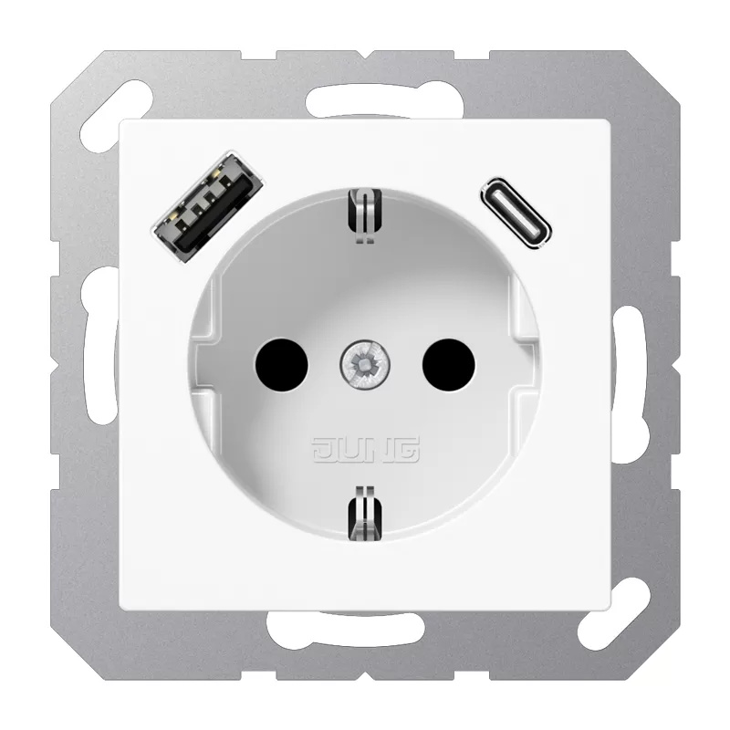Kategorie: Steckdosen - Jung - GTIN:4011377184329 - mit integriertem erhöhten Berührungsschutz (Safety Plus) mit 1 USB-Buchse Typ A und 1 USB-Buchse Typ C mit Federklemmen für starre und unbehandelte flexible Leiter bis 2,5 mm2 Verbindungsklemmen nach DIN VDE 0620 Montage in Gerätedose mit Abmessungen nach DIN 49073 Tiefe der Gerätedose (Innenmaß): min. 57 mm Material: Thermoplast - 57,40 Euro bei etoh24 - gefunden von billiger.de ![]() ![]() JUNG Steckdose SCHUKO A1520-15CAWW m.USB Typ AC