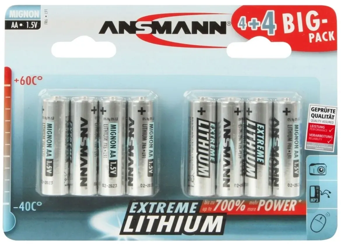 20 Händlerangebote bei billiger.de - Kategorie: Batterien & Akkus - Ansmann - Bis 700% mehr Power Die Lithium-Batterien bieten ein vielfaches an Leistung gegenüber einer Zink-Kohle-Batterie. Topleistung auch bei extremsten Temperaturen von -40 C bis +60 C Ob bei extremer Kälte, auf dem Berg oder unter Wasser - Extreme Lithium sind die Batterien für professionelle Anforderungen. Sie sind ausgesprochen unempfindlich gegen Minustemperaturen. Ultraleicht Die Lithium Batterien sind rund 35% leichter als normale Alkaline Batterien. Dies ist bei sämtlichen Outdoor-Aktivitäten oder auf Reisen von großem Vorteil, welcher sich schnell bezahlt macht. Lange Haltbarkeit Die Lithium Batterien bieten Ihnen zuverlässige Leistung und eine lange Haltbarkeit (1 ) bei einem sehr guten Preis-Leistungsverhältnis. Geprüfte Qualität ANSMANN Batterien sind erfolgreich auf elektrische, thermische, geometrische und mechanische Anforderungen geprüft. Durch strenge Tests in Deutschland und Fernost können wir höchste Produktqualität gewährleisten. Unsere Qualitäts-Experten kontrollieren regelmäßig die Einhaltung unserer hohen Anforderungen sowie internationaler Standards. - GTIN:4013674021901 Dieses 16er-Pack Amazon Basics wiederaufladbare NiMH AA-Batterien bietet eine hohe Kapazität und ist bis zu 400-mal aufladbar. ![]() ![]() Amazon Basics 16er-Pack wiederaufladbare AA-NiMH-Batterien mit hoher Kapazität, 2400 mAh, 1,2 V, bis zu 400-mal aufladbar, vorgeladen