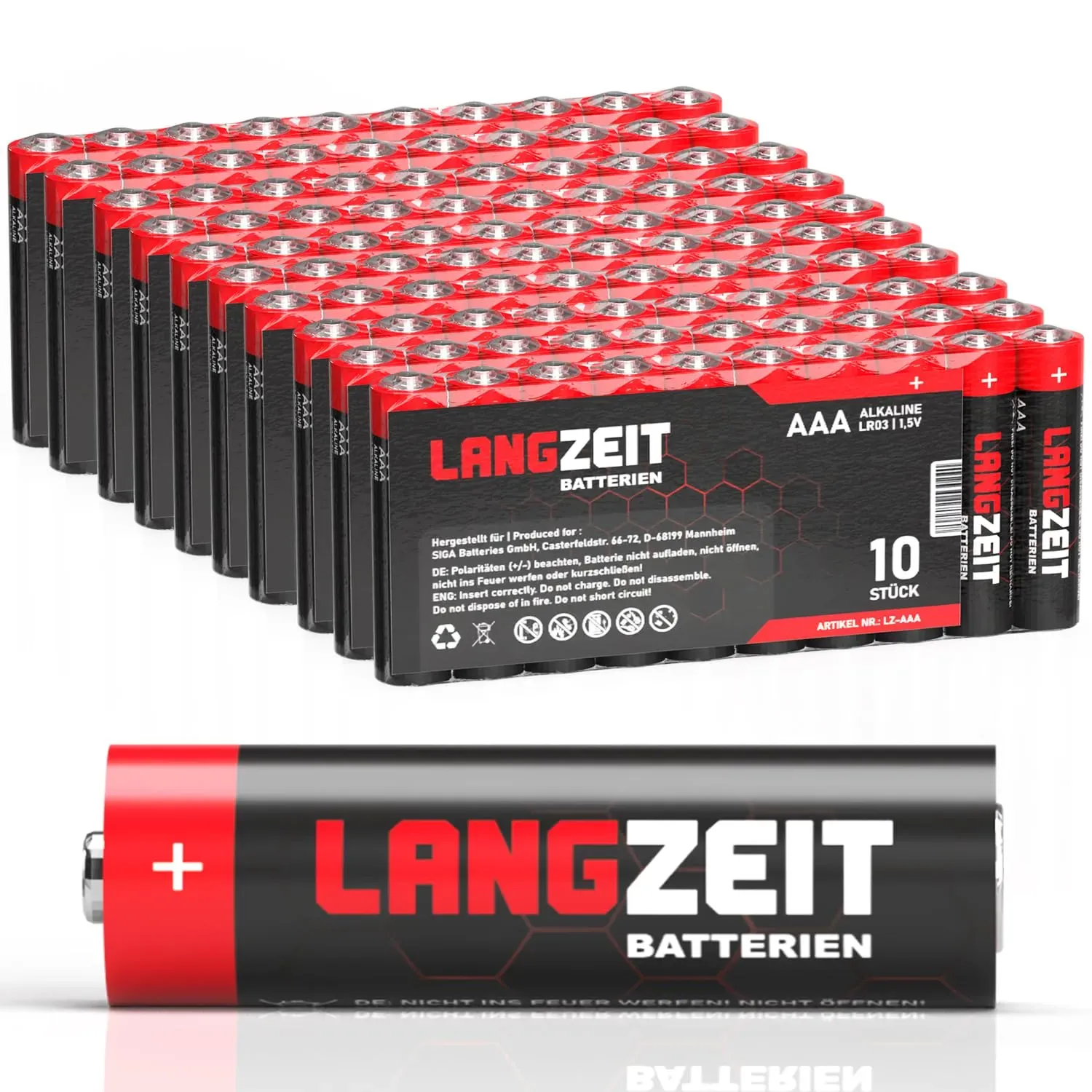 Kategorie: Batterien & Akkus - LANGZEIT Batterien - GTIN:4260713248267 - EXTREM LANGLEBIG: Die LANGZEIT AAA Batterien bieten eine beeindruckende Lebensdauer, sowohl im aktiven als auch im passiven Zustand. Ideal für den Vorratskauf und die langfristige Lagerung. Perfekt geeignet für Geräte, die über längere Zeiträume hinweg eine konstante Stromversorgung benötigen, wie Fernbedienungen, Uhren oder Außenbeleuchtungen. INTENSIVE NUTZUNG: Dank ihrer innovativen Bauweise und hochwertigen Komponenten liefern die LANGZEIT Batterien eine zuverlässige und gleichmäßige Stromversorgung. Egal ob für langfristige Anwendungen wie kabellose Tastaturen und Mäuse oder kurzfristige Hochleistungsanwendungen wie Taschenlampen und Kameras diese AA Batterien bieten eine konstant hohe Leistung, die herkömmliche Batterien übertrifft. AUSLAUFSICHER FüR MAXIMALE SICHERHEIT: Die LANGZEIT Batterien sind mit einem fortschrittlichen Leckschutz ausgestattet, der dafür sorgt, dass keine Luft oder Flüssigkeiten eindringen und keine Säure austreten kann. Dies bietet eine sichere Verwendung in empfindlichen Geräten wie Babyphones, medizinischen Geräten oder Spielzeugen, ohne das Risiko von Korrosion oder Schäden. MODERNSTE TECHNOLOGIE FüR MAXIMALE LEBENSDAUER: Mit der neuesten Batterie-Technologie ausgestattet, bieten die LANGZEIT Batterien eine verlängerte Lebensdauer im Vergleich zu herkömmlichen Batterien. Ob für energieintensive Geräte wie Blitzgeräte und Spielkonsolen oder für Haushaltsgeräte, die eine ... Dieses Angebot von Intenso bietet ein gutes Preis-Leistungs-Verhältnis für ein 100er-Pack Alkaline AAA-Batterien. Mediamarkt .de Intenso Energy Ultra Alkaline AAA 100 Pack AAA, LR 6, Mignon, Manganese (Quecksilberfrei) Batterien, 1,5 Volt