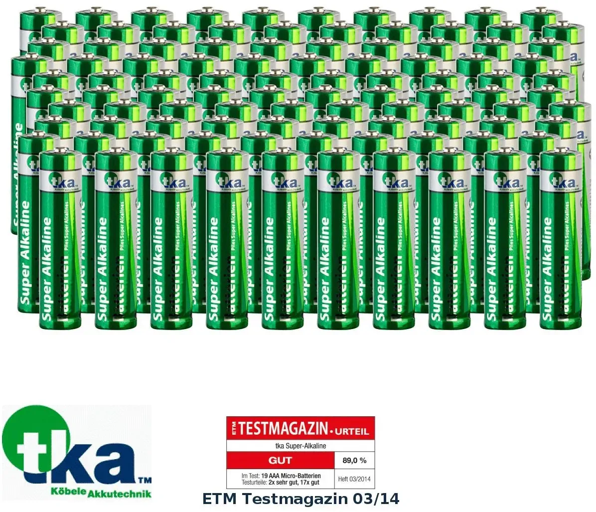 2 Händlerangebote bei billiger.de - Kategorie: Batterien & Akkus - Tka - Die PEARL-Batterie bringt noch mehr Extra-Energie! Die Super-Alkaline-Batterie mit dem PEARL Power-Plus! Mehr Ausdauer für Radio, Taschenlampe, Wecker, Fernbedienung, Spielzeug-Hubschrauber & Co. * Ultra-Sparpack mit 100 Batterien Micro AAA * Umweltverträglich, da frei von Quecksilber und Cadmium * Kapazität: 1250 mAh * Spannung: 1,5 V Bei PEARL finden Sie übrigens auch besonders preiswerte NiMH-Akkus für alle wichtigen Batterie-Typen. Bitte entsorgen Sie Batterien nur über die dafür vorgesehenen Sammelstellen oder an der Verkaufsstelle. - GTIN:4022107987356 Ansmann bietet ein 100er-Pack Alkaline AAA-Batterien, die sich gut für verschiedene Haushaltsgeräte eignen. ![]() ![]() Ansmann Batterien AAA 100 Stück - Alkaline Micro Batterie ideal für Lichterkette, LED Taschenlampe, Spielzeug, Fernbedienung, Wetterstation, Radio, Nachtlicht, Uhr, Micro AAA