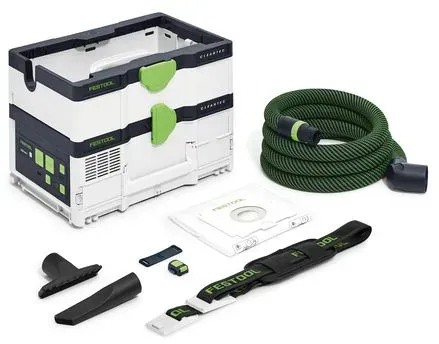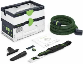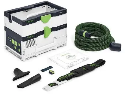 Kategorie: Nass-/Trockensauger - Festool - GTIN:4014549388891 - Zum Umhängen: Der Akku-Sauger im Systainerformat. Eigenschaften: Maximal mobil: Kompaktes Systainerformat und minimales Gewicht, dadurch perfekt zu transportieren Komfortabel: Durch Tragegurt einfach zum Umhängen und gerade so groß wie er sein muss, dank abnehmbarem Schlauchdepot Unabhängig: Absaugen ganz ohne Steckdose mit 2 x 18 V (4,0 Ah) Akkupacks Leistungsstark: Durch die 36 V-Turbine vergleichbare Power wie ein Kabel-Sauger Regulierbar: Drei Stufen zur Einstellung der Saugleistung Unterbrechungsfrei: Mit vier Akkupacks und Schnellladegerät TCL 6 DUO in den meisten Akku-Anwendungen durchgängig Arbeiten Praktisch: Einschalten des Saugers über den Bluetooth Akkupack oder die Fernbedienung Kompatibel: Koppelbar mit Systainern und integrierbar in die bott-Fahrzeugeinrichtung Gesünder arbeiten: In der Staubklasse L Anwendung Ideal für den mobilen Einsatz bei Servicearbeiten Absaugung von Akku-Werkzeugen dank integrierter Bluetooth Funktion Für kleine und kurzzeitige Schleif-, Säge- und Bohrarbeiten Ideal für die Endreinigung nach der Arbeit Für Stäube mit Grenzwerten 1mg/m3 Bluetooth Funktionalität für Sauger Ferneinschaltung bei Akku-Werkzeugen Behälter-/Filtersackvolumen 4,5/3,5 l Zulassung für Staubklasse L Nur zum Trockensaugen geeignet Lieferumfang Ohne Akkupack, ohne Ladegerät, Hauptfilter, Filtersack montiert, Saugschlauch glatt 27 x 3 m-AS/CT mit Winkeldrehausgleich saugerseitig, Schlauchdepot, ... Dieses Angebot von tuul.zone ist eine weitere gute Option im mittleren Preissegment für das CTLC SYS I-Basic. ![]() ![]() Festool Akku-Absaugmobil CLEANTEC CTLC SYS I-Basic - 576936