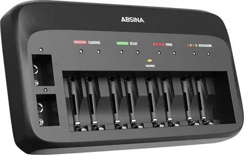 ABSINA - EAN: 4260368681075 - Intelligentes Batterieladegerät mit mikro-controllerüberwachter Ladesteuerung & Einzelschachtüberwachung zur sicheren & akkuschonenden Aufladung. Das kompakte Gehäusedesign ermöglicht einen weltweiten Einsatz & gleichzeitiges Laden von 1-8 AAA/AA + 1-2 9V NiMH Akkus. Die automatische Abschaltung & Spannungsüberwachung dU mit zusätzlichem Sicherheitstimer ermöglichen ein Aufladen unter höchsten Sicherheitsstandards. - bei voelkner.de - aus Yadore Produktdaten ![]() kaufland.d e ABSINA X10 Akkuladegerät für AA, AAA & 9V - Batterieladegerät für NiMH Akkus - Ladegerät für Mirco, Mignon & 9V Akku 301003