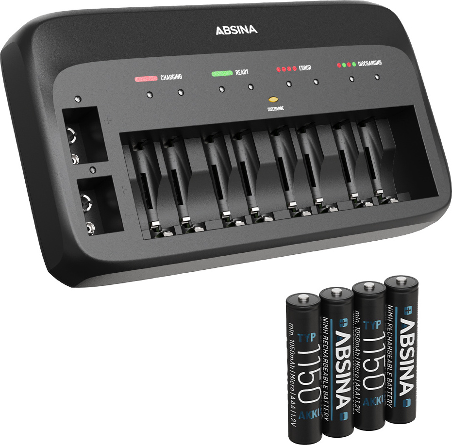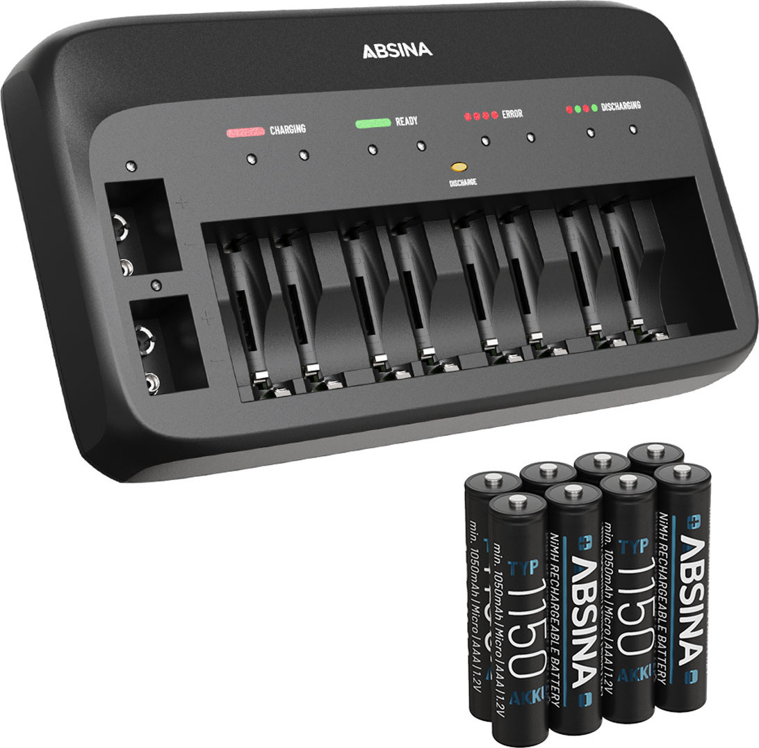 Auf Lager Versand durch AmazonABSINA Akku Ladegerät X10 für AA, AAA & 9V - Akkuladegerät inkl. 8X AAA 1150 Akkus - NiMH Ladegerät 10-Fach für Wiederaufladbare Micro, Mignon & 9V Block Akkus - Batterieladegerät