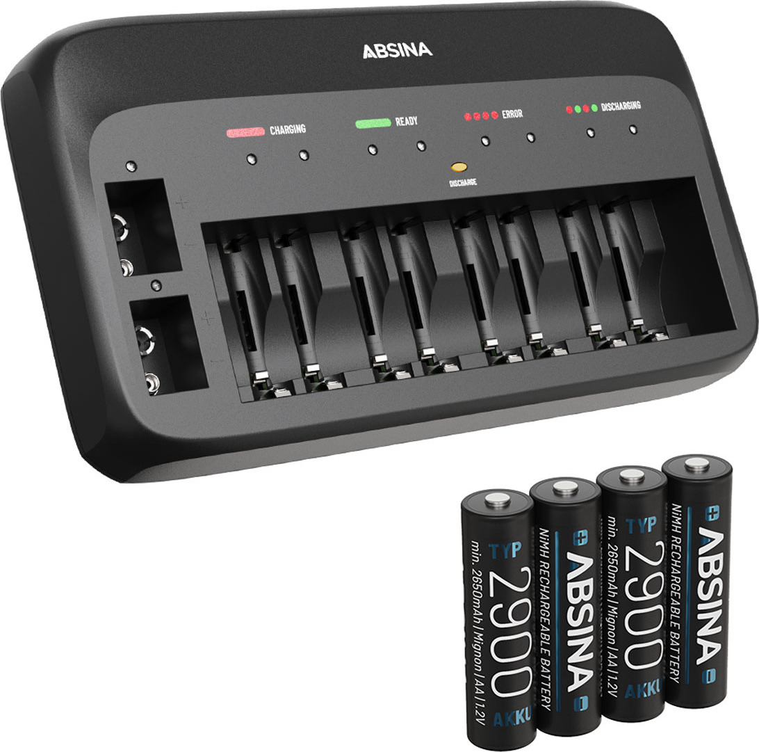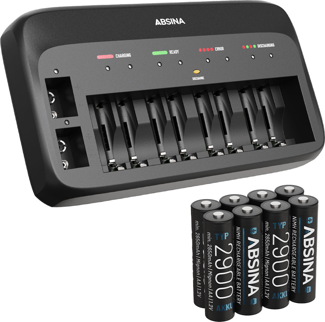 Auf Lager Versand durch AmazonABSINA Akku Ladegerät X10 für AA, AAA & 9V - Akkuladegerät inkl. 8X AA 2900 Akkus - NiMH Ladegerät 10-Fach für wiederaufladbare Micro AAA, Mignon AA & 9V Block Akkus - Batterieladegerät