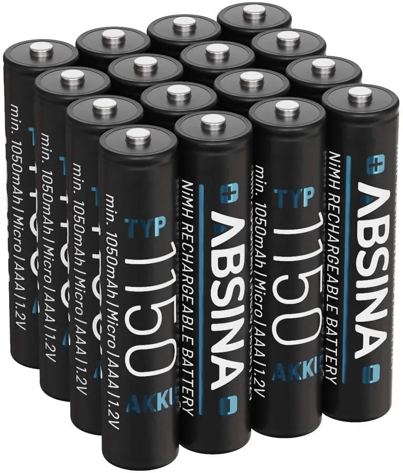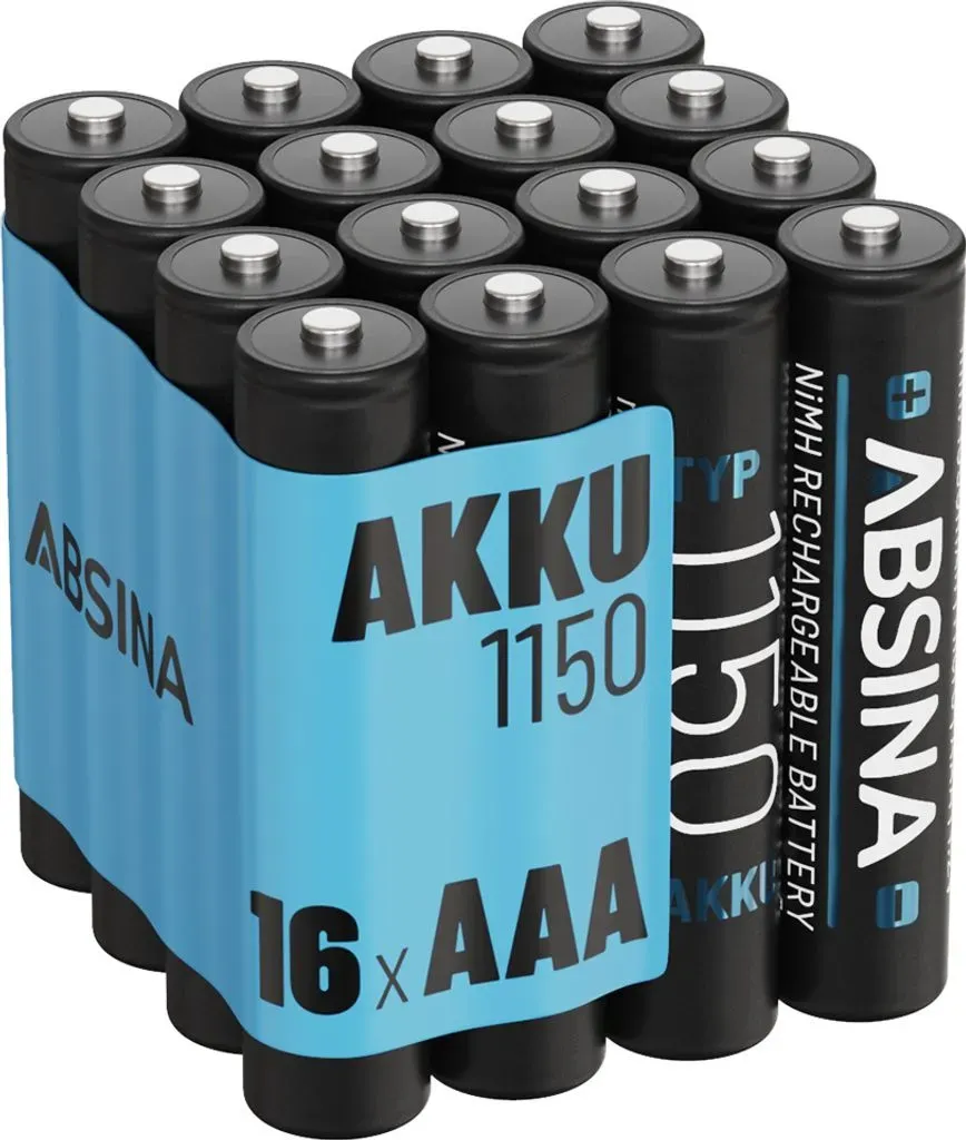Auf Lager Versand durch AmazonABSINA AAA Akku 1150 NiMH 16er Pack - Akku AAA Micro mit 1,2V & min. 1050 mAh - AAA Akkus wiederaufladbar für Geräte mit hohem Stromverbrauch - Batterien AAA wiederaufladbar ideal für DECT Telefon