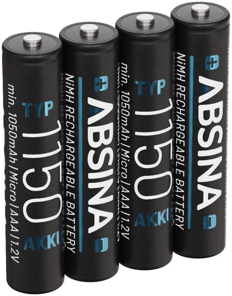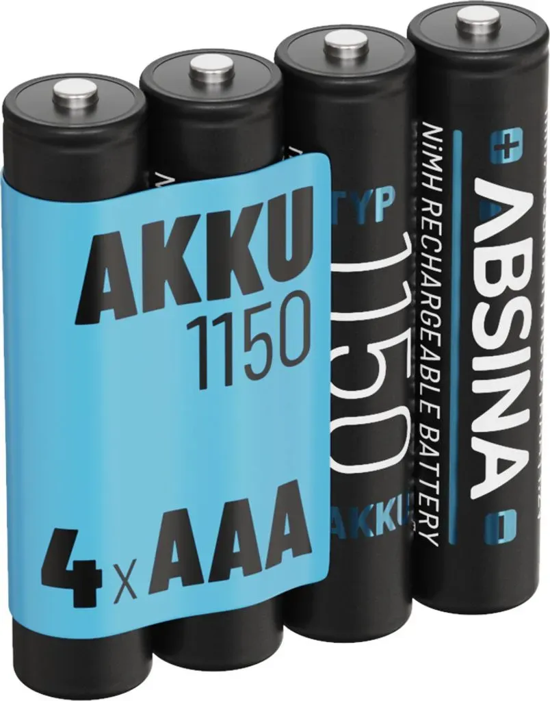 Auf Lager Versand durch AmazonABSINA AAA Akku 1150 NiMH 4er Pack - Akku AAA Micro mit 1,2V & min. 1050 mAh - AAA Akkus wiederaufladbar für Geräte mit hohem Stromverbrauch - Batterien AAA wiederaufladbar ideal für DECT Telefon