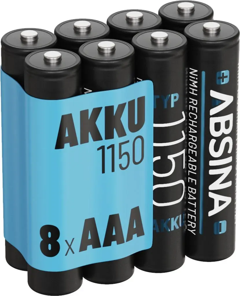 Auf Lager Versand durch AmazonABSINA 8X AAA Akku 1150 NiMH mit 1,2V & min. 1050 mAh - AAA Akkus wiederaufladbar für Geräte mit hohem Stromverbrauch - Batterien AAA wiederaufladbar ideal für DECT Telefon - Akku AAA Micro