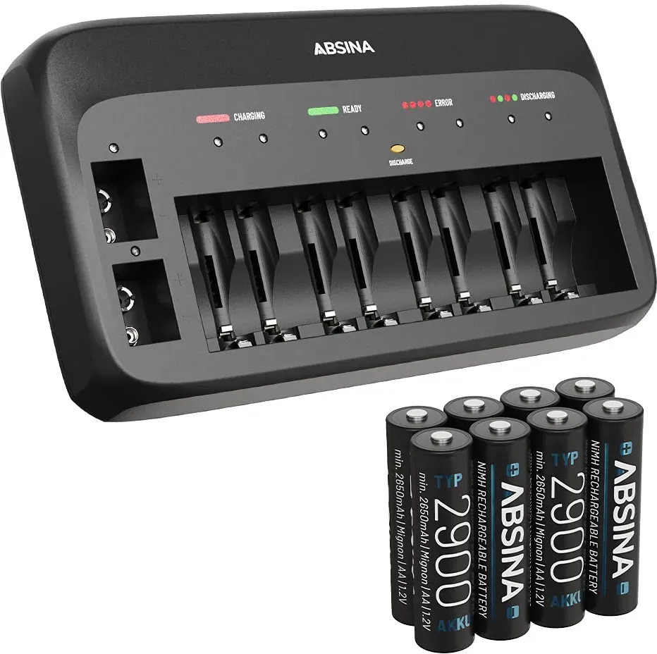 ABSINA - EAN: 4260368681075 - Intelligentes Batterieladegerät von Absina mit mikro-controllerüberwachter Ladesteuerung & Einzelschachtüberwachung zur sicheren & akkuschonenden Aufladung. Das kompakte Gehäusedesign ermöglicht einen weltweiten Einsatz & gleichzeitiges Laden mehrerer Akkus. Die automatische Abschaltung & Spannungsüberwachung dU mitzusätzlichem Sicherheitstimer ermöglichen ein Aufladen unter höchsten Sicherheitsstandards. - bei galaxus.de - aus Yadore Produktdaten Ein gutes Starter-Set mit dem Ladegerät und 4 AAA Akkus, ideal für den Einstieg. ![]() ![]() ABSINA Akku Ladegerät X10 für AA, AAA & 9V - Akkuladegerät inkl. 4X AAA 1150 Akkus - NiMH Ladegerät 10-Fach für wiederaufladbare Micro AAA, Mignon AA & 9V Block Akkus - Batterieladegerät