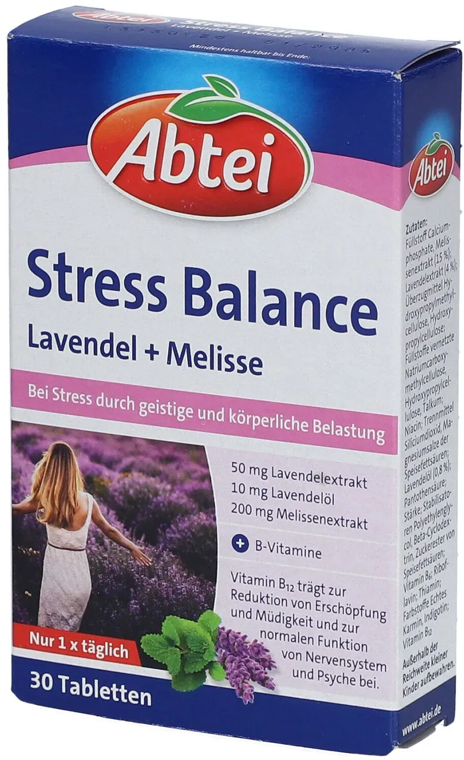 0,18 /Stück - Kategorie: Arzneimittel - Abtei - GTIN:4250752204782 - PZN:17944082 - Nahrungsergänzungsmittel sind kein Ersatz für eine ausgewogene und abwechslungsreiche Ernährung und eine gesunde Lebensweise.Abtei Stress Balance mit Melisse LavendelBei Stress durch geistige und körperliche Belastung Bei Stress durch geistige und körperliche Belastung Vitamin B2, Pantothensäure und Vitamin B12 tragen zur Verringerung von Erschöpfung und Müdigkeit bei Pantothensäure unterstützt eine normale geistige Leistung Vitamine B1, B6 und B12 sind wichtig für eine normale psychische Funktion, die Nerven und den Energiestoffwechsel Mit bewährtem Lavendelextrakt und -öl sowie Melissenextrakt Stress, Hektik, Zeitdruck und überlastung im Berufs- oder Privatleben können dazu führen, dass die körperliche und geistige Leistungsfähigkeit an ihre Grenzen kommt. Abtei Stress Balance vereint die Wirksamkeit der bewährten Naturpflanzen Melisse und Lavendel. Mit dem sorgfältig ausgewählten Vitamin-B-Komplex tragen Abtei Stress Balance -Tabletten dazu bei, mentales Wohlbefinden sowie innere Ausgeglichenheit zu erhalten und dadurch die Herausforderungen des Alltags besser zu meistern.Zutaten: Füllstoff Calciumphosphate, Melissenextrakt (15 %); Lavendelextrakt (4 %); überzugmittel Hydroxypropylmethylcellulose, Hydroxypropylcellulose; Füllstoffe vernetzte Natriumcarboxymethylcellulose, Hydroxypropylcellulose, Talkum; Niacin; Trennmittel Siliciumdioxid, Magnesiumsalze der Speisefettsäuren; Lavendelöl ... juvalis.de Abtei Stress Balance Lavendel+Melisse Tabletten Tf